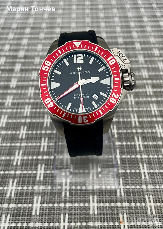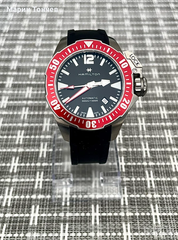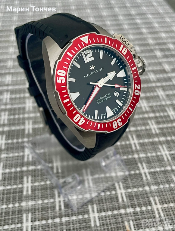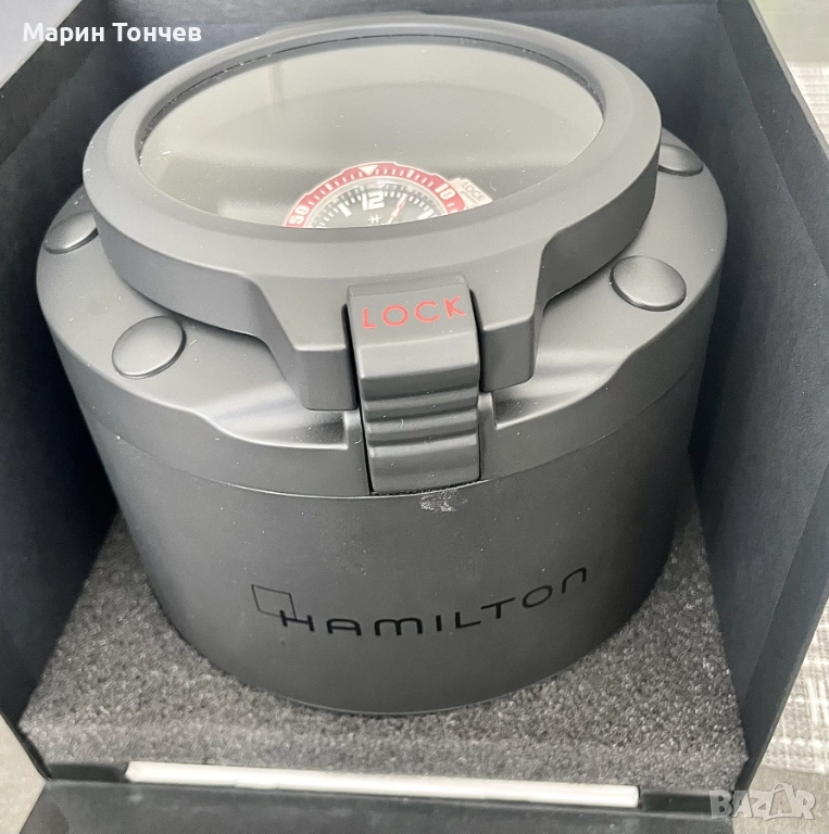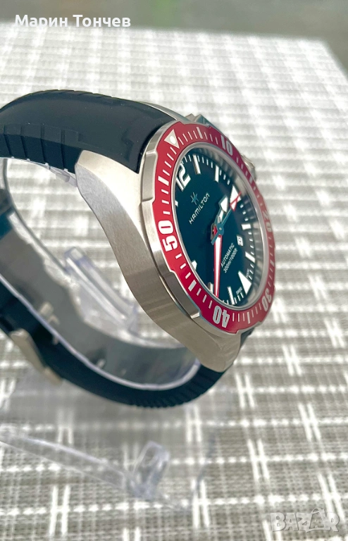 Отличен часовник тип diver – Hamilton Khaki Navy Frogman. Корпусът е 42 мм (без коронката), изработен в комбинация от полирана и матирана 316L стомана, с еднопосочен, стегнат безел – 120 клика, и червен алуминиев инсърт. Стъклото е устойчиво на надраскване сапфирено (Sapphire Crystal) с антирефлексно (AR) покритие. Задвижва се от надеждния автоматичен швейцарски механизъм Hamilton calibre H-10, базиран на ETA C07.111, с хак функция, ръчно навиване и резерв от завидните 80 часа. Капакът е гравиран, плътна стомана - на винт. Коронката също е на винт, с ефектен протектор. Черен циферблат със светещи сребристи стрелки във формата на стрела, арабска цифра на позиция 12 часа и минутни маркери по външния ръб. Водоустойчивост от 300 м / 1000 ft, добра подсветка Super-LumiNova върху стрелките и маркерите и дата между 4 и 5 часа. С оригиналната гумена каишка в перфектно състояние.