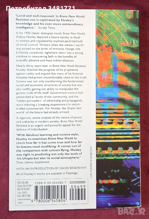 Двадесет и седем години по-късно, се чувствам далеч по-малко оптимистичен, отколкото бях, когато пишех „Прекрасния нов свят“. Пророчествата, направени някога, се сбъдват много по-рано, отколкото си мислех. Благословеният интервал между твърде малкото ред и кошмара от твърде много не е започнал и не показва никакви признаци, че ще започне. На Запад, вярно е, отделните мъже и жени все още се радват на голяма степен на свобода. Но дори и в страните, които имат традиция на демократично управление, тази свобода и дори желанието за тази свобода сякаш намалява. В останалата част от света свободата за отделните хора вече е отминала или очевидно е на път да отмине. Кошмарът на тоталната организация, който бях поставил в седми век след Форд, се е появил от безопасното, далечно бъдеще и сега ни очаква, точно зад следващия ъгъл."