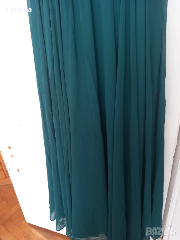 Дамска официална масленозелена дълга рокля с сатенена подплата. Роклята е обличана веднъж за няколко часа. Без забележки.