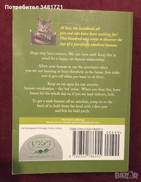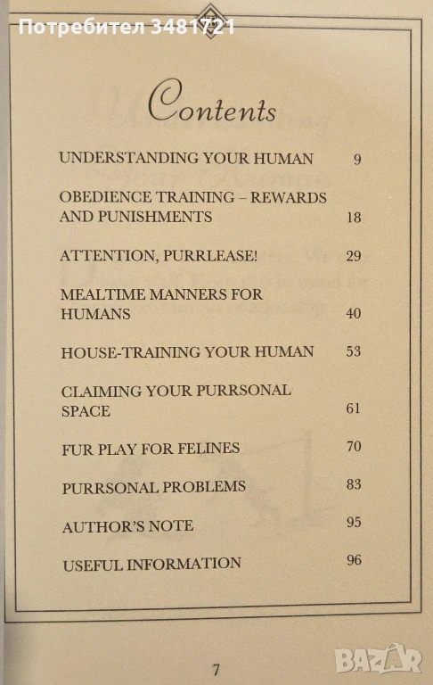 "Кучетата имат собственици и господари, ние, котките, имаме прислуга." Това е стилът на тази книга. С много хумор, тя представя правилата, по които домашната котка трябва да се води, за да създаде подходящите и комфортни за себе си навици у останалите членове на домакинството. Как да ги тренираш да ти дават само прясна храна? Как да ги отучиш да добавят ароматизатори в котешката тоалетна? Защо всичко, което не е заковано, спада към категорията "играчки за котки" и защо ако чуеш думата "бълхи" трябва да бягаш през глава, за да избегнеш това, което предстои.