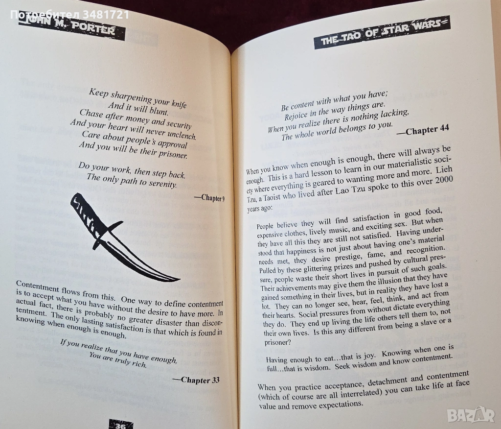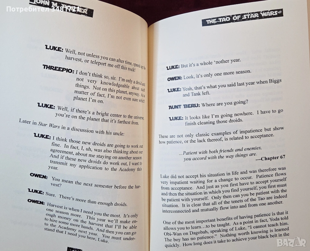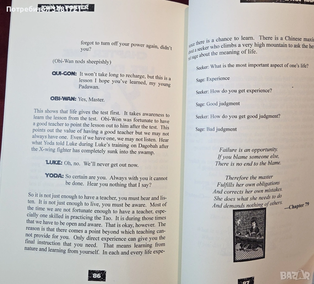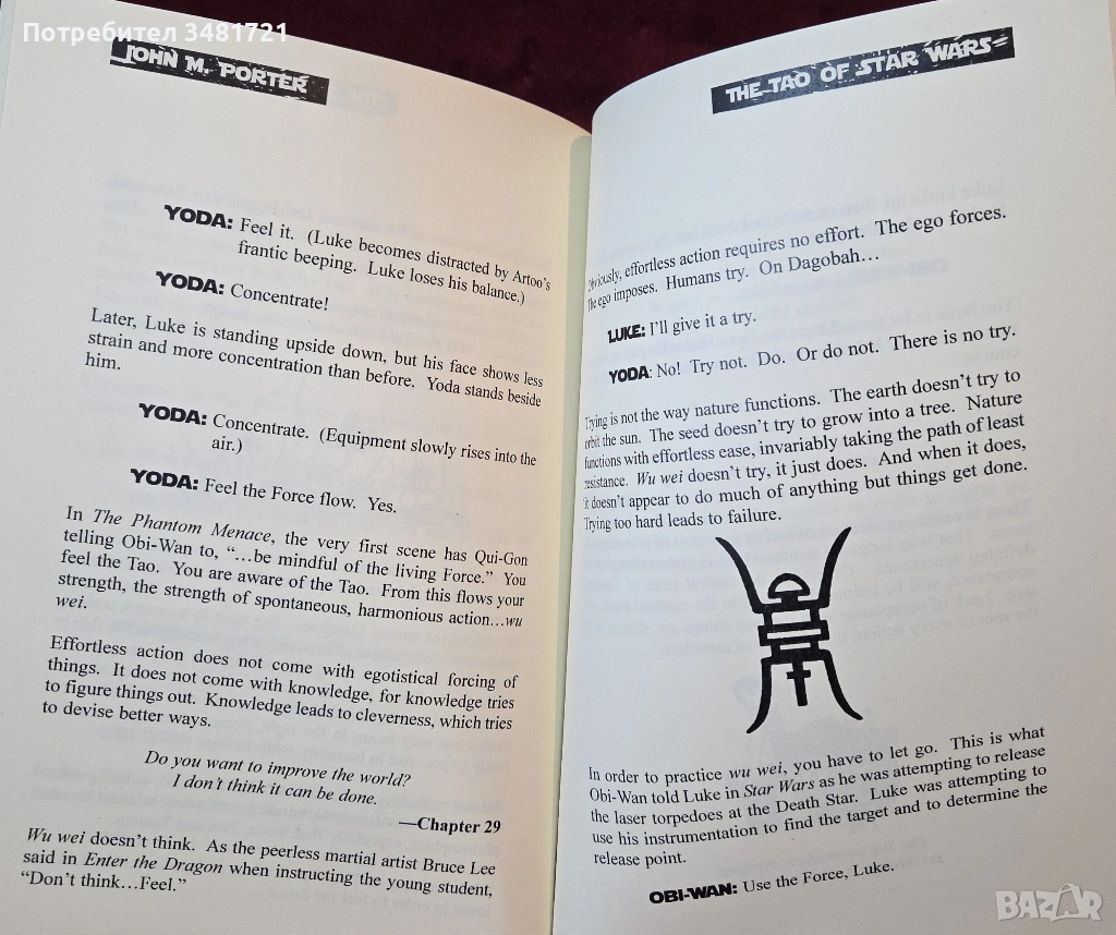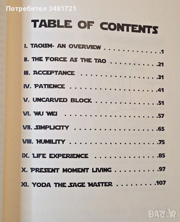 Тази книга използва мотивите и героите в поредицата Star Wars, през които да обясни основните принципи на даоизма. Някои от тях са добре познати и универсални - търпение, толерантност, простота. Други, вероятно ще са донякъде чужди за света на западния човек, защото техните философски обяснения не винаги са практични за приложение в ежедневието.