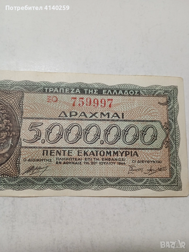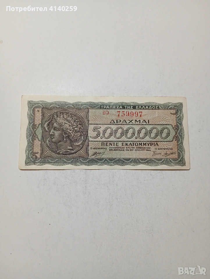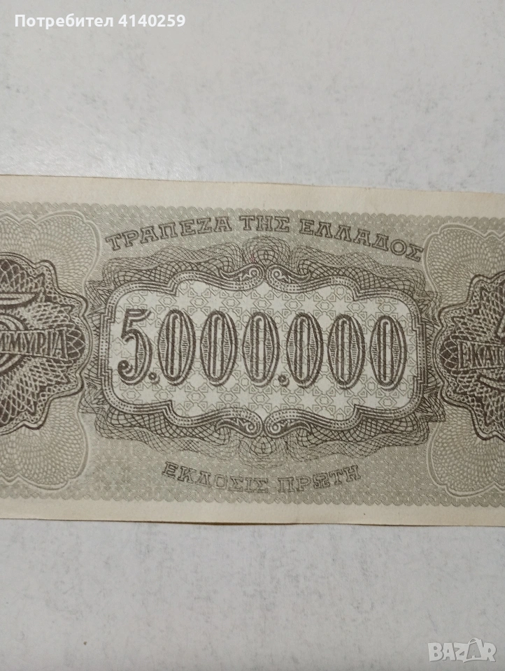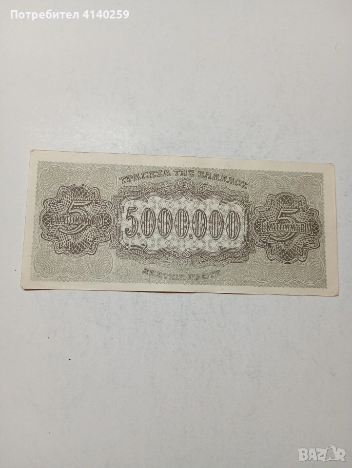 ГЪРЦИЯ БАНКНОТА 5,000,000 ДРАХМИ 1944 Г СЪСТОЯНИЕ ВИДИМО ПОЛУЧАВАТЕ СНИМАНАТА БАНКНОТА РАЗГЛЕДАЙТЕ ДРУГИТЕ МИ ОБЯВИ ДА КОМБИНИРАТЕ ДОСТАВКА ЕКОНТ ЗА ВАРНА ЛИЧНО