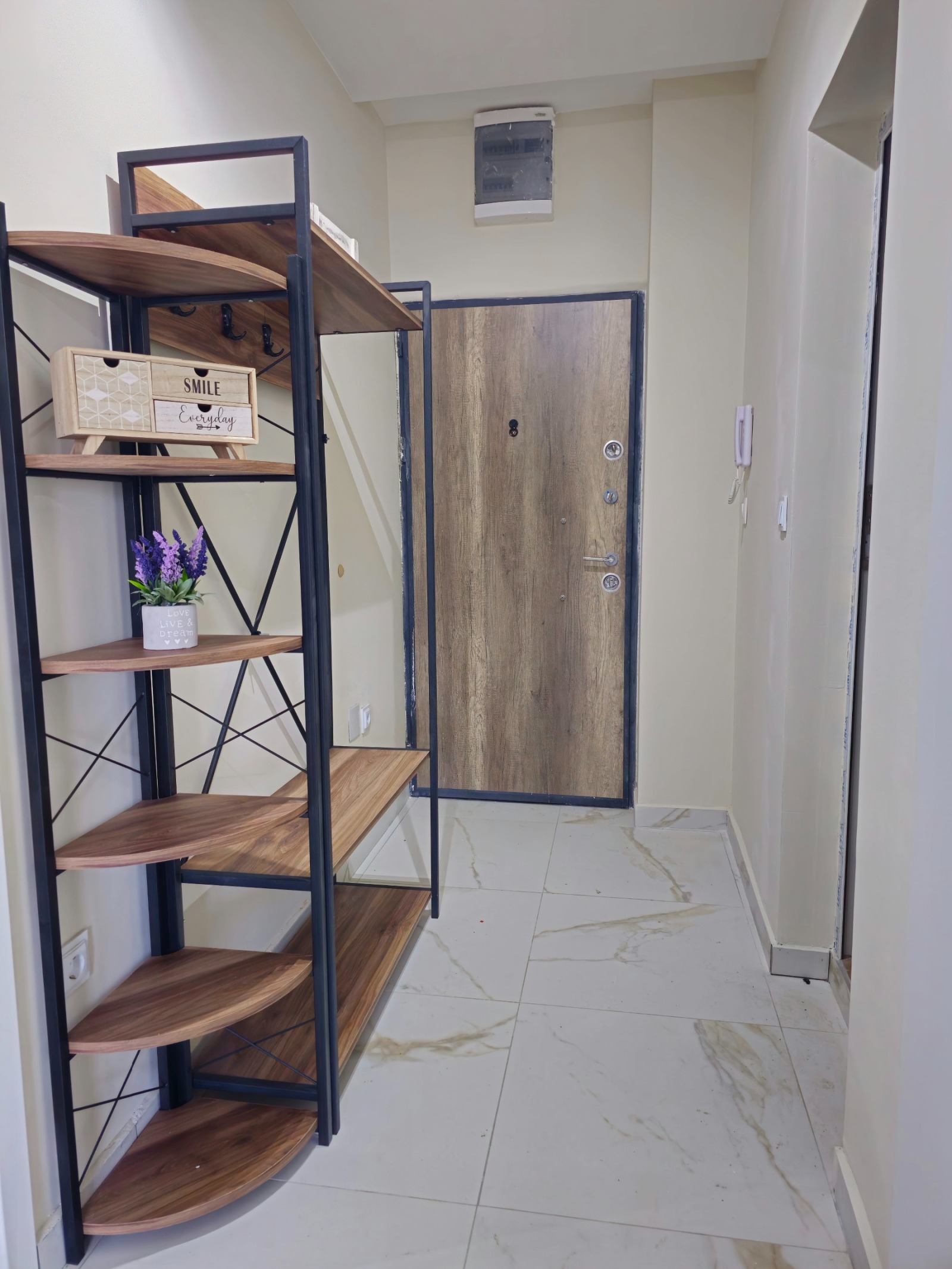 Разпределението включва: просторна спалня с king size легло, стилна баня с тоалетна, светъл хол с кухненски бокс, който е напълно оборудван с всички необходими електроуреди за едно съвременно домакинство и голяма тераса.