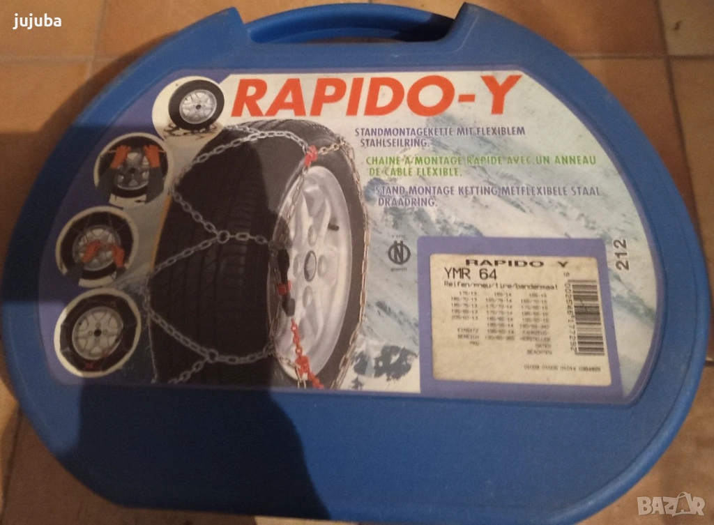 Класическа метална верига YMR64 Rapido Y с фокус върху бързия монтаж (задвижващи колела), проектирана за сериозно натоварване. Цена 55 евро с опция за договаряне. Метална структура със звена от закалена стомана издръжлива на десетки километри върху заснежен или заледен път, златен стандарт за органи на реда, пътни служби. При правилно поставяне, не се деформира от тежестта на автомобила. При правилна употреба и поддръжка (измиване от сол, т.н.), продължителност на живот 5-10 сезона, т.е. стотици километри върху сняг. Гъвкав вътрешен стоманен кабел за монтиране на веригата без да се мести автомобила, със закопчаване от вътрешната страна на гумата, спестяващ нуждата от вдигане на колата на крик и намаляващ стреса от монтаж на път в тежки условия. Съчетание на традиция и иновация с 9-мм-ва дебелина на звеното, проектирано за съвременни автомобили с ограничено пространство между гума и окачване, където стандартни вериги биха нанесли щети. Вид мечо зацепване (ромбоидна плетка) за лесен монтаж без преместване на автомобила. Диамантена шарка за непрекъснат контакт с пътя, спомагаща за по-предвидима работа на електронни системи като ABS и ESP при прескачането на гумата върху по-дебели пътни звена. Оптимизирана механика със самозатягащи се механизми (в някои версии) за намалена необходимост от спиране след 50-ина метра за дозатягане. Подходяща за лети джанти при бюджетни коли