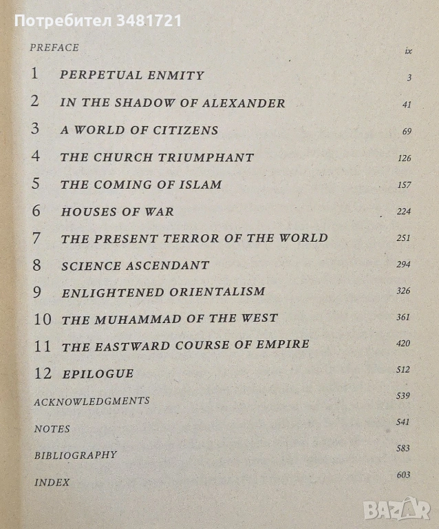 Връзката между Изтока и Запада винаги е била изпълнена с бури. В това историческо пътешествие, авторът ни води от света на класическата античност, през Тъмните векове, до кръстоносните походи, възраждането на Европа и господството на Османската империя. Страниците на книгата преминават от Наполеон в Египет до разделянето на окончателно отмиращата Османска империя от Европа, така създавайки съвременния Близък Изток, за да стигне авторът до днешните сблъсъци в Ирак.