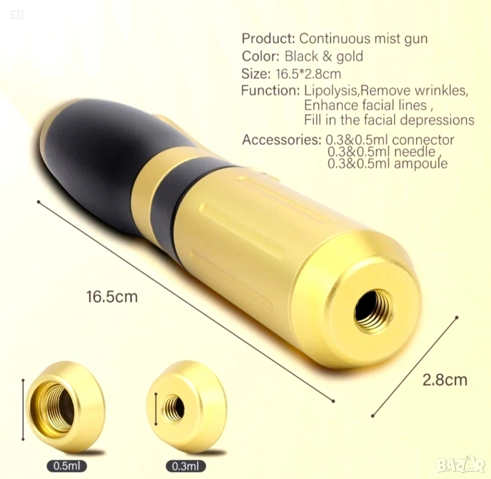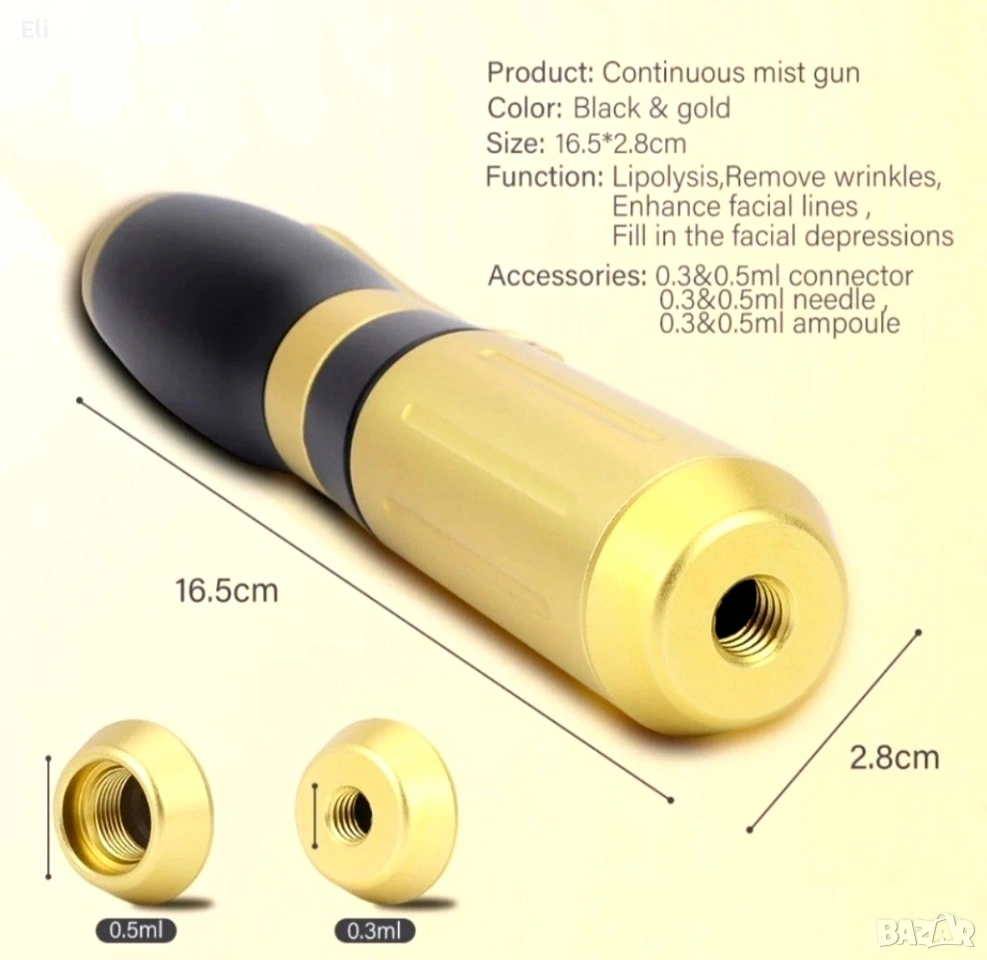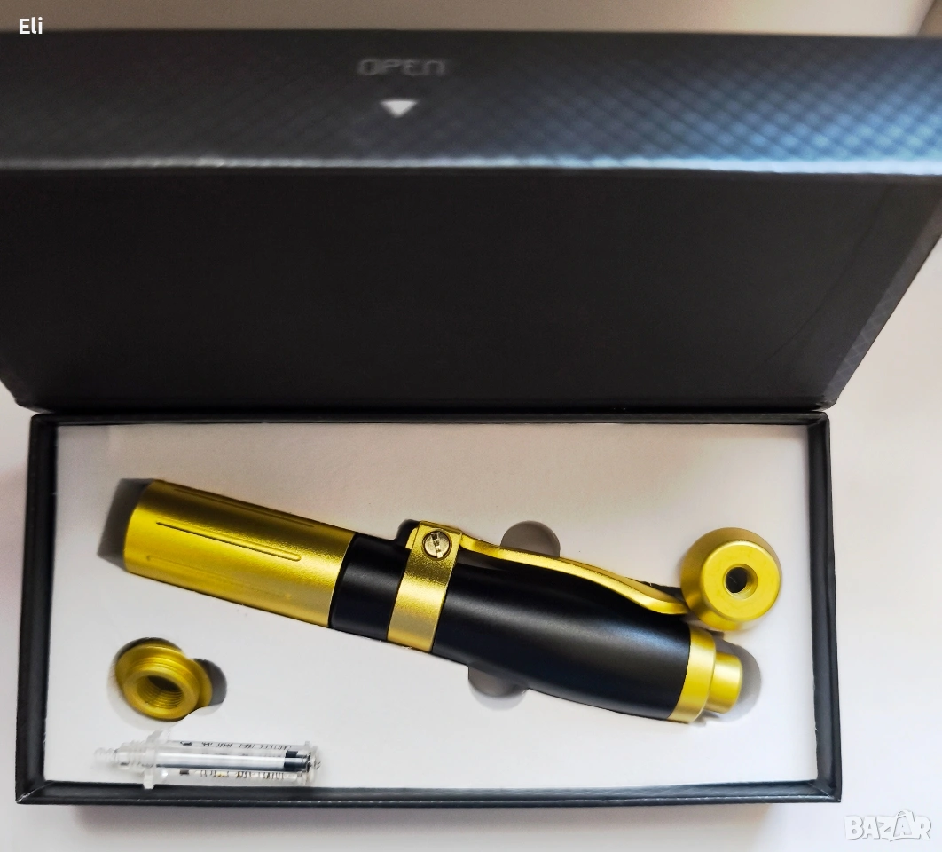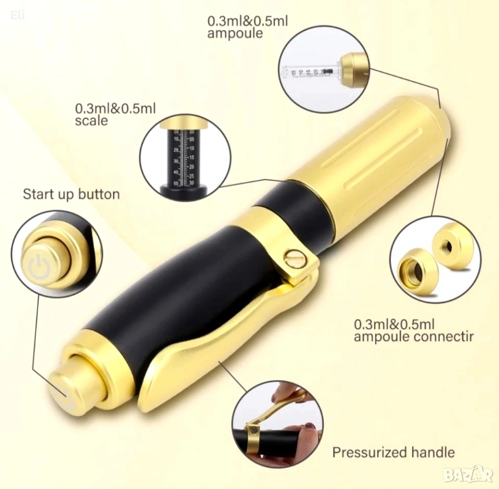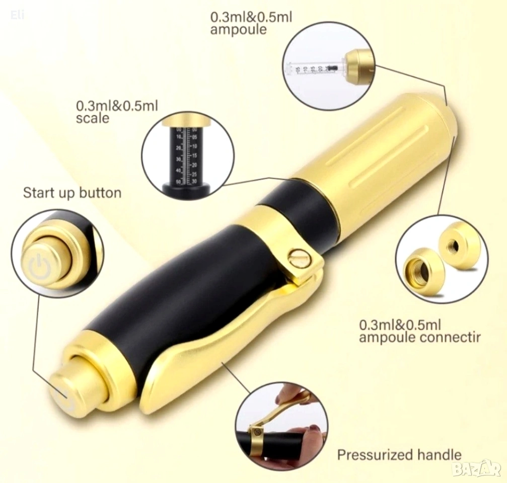 Механизъм: Устройството използва пружина и бутало, които под високо налягане вкарват продукта през микроскопичен отвор директно в подкожния слой.
