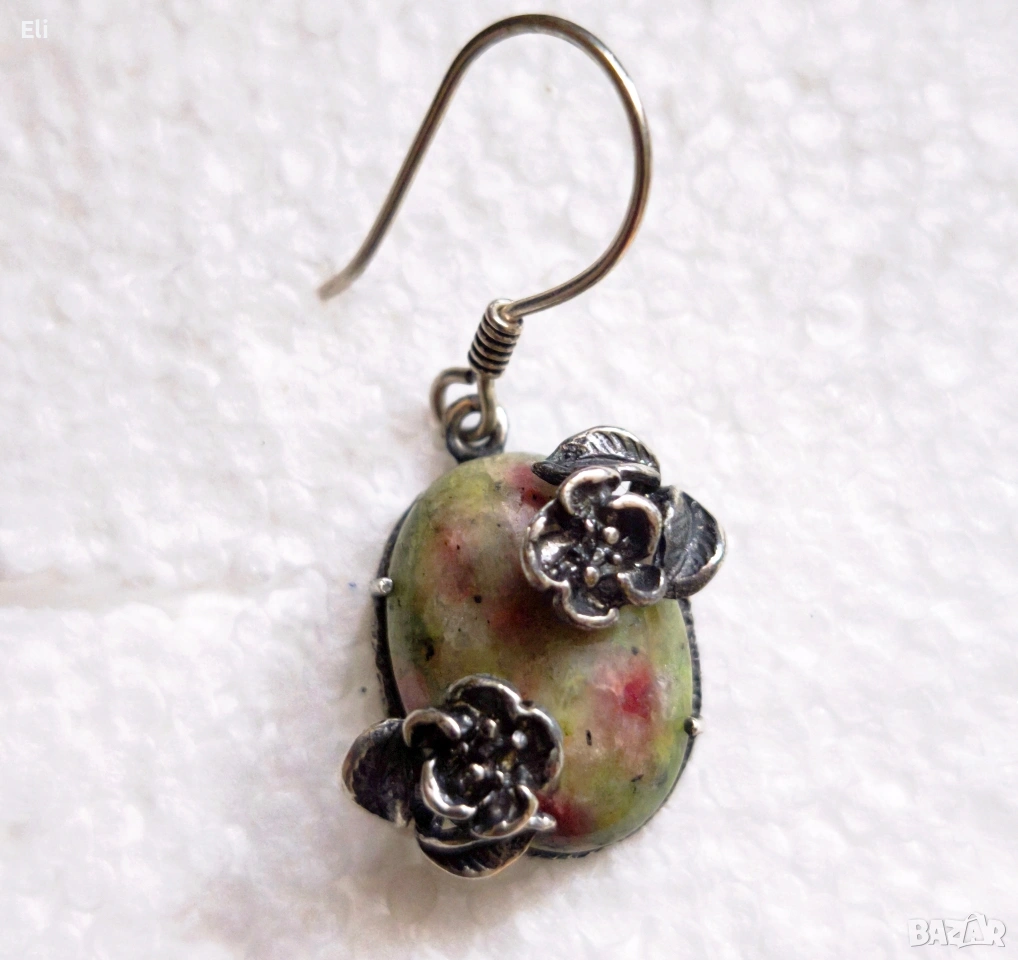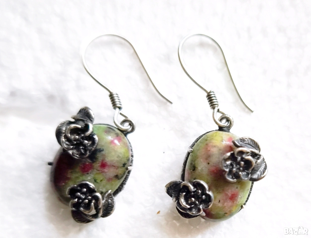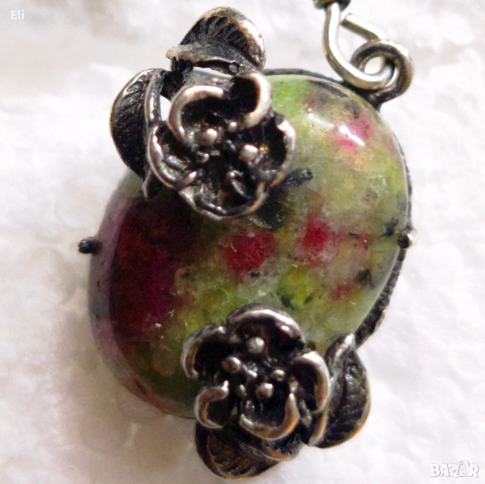 изработени от естествен камък рубин в цоизит, известен още като аниолит, и сребърни орнаменти с флорални мотиви.
