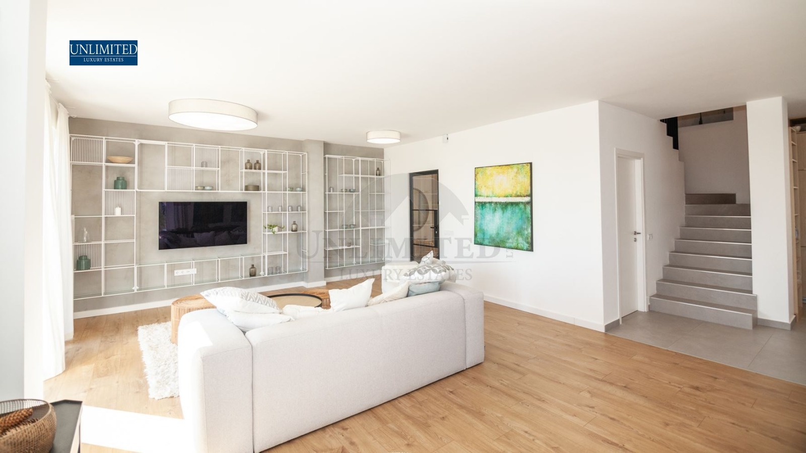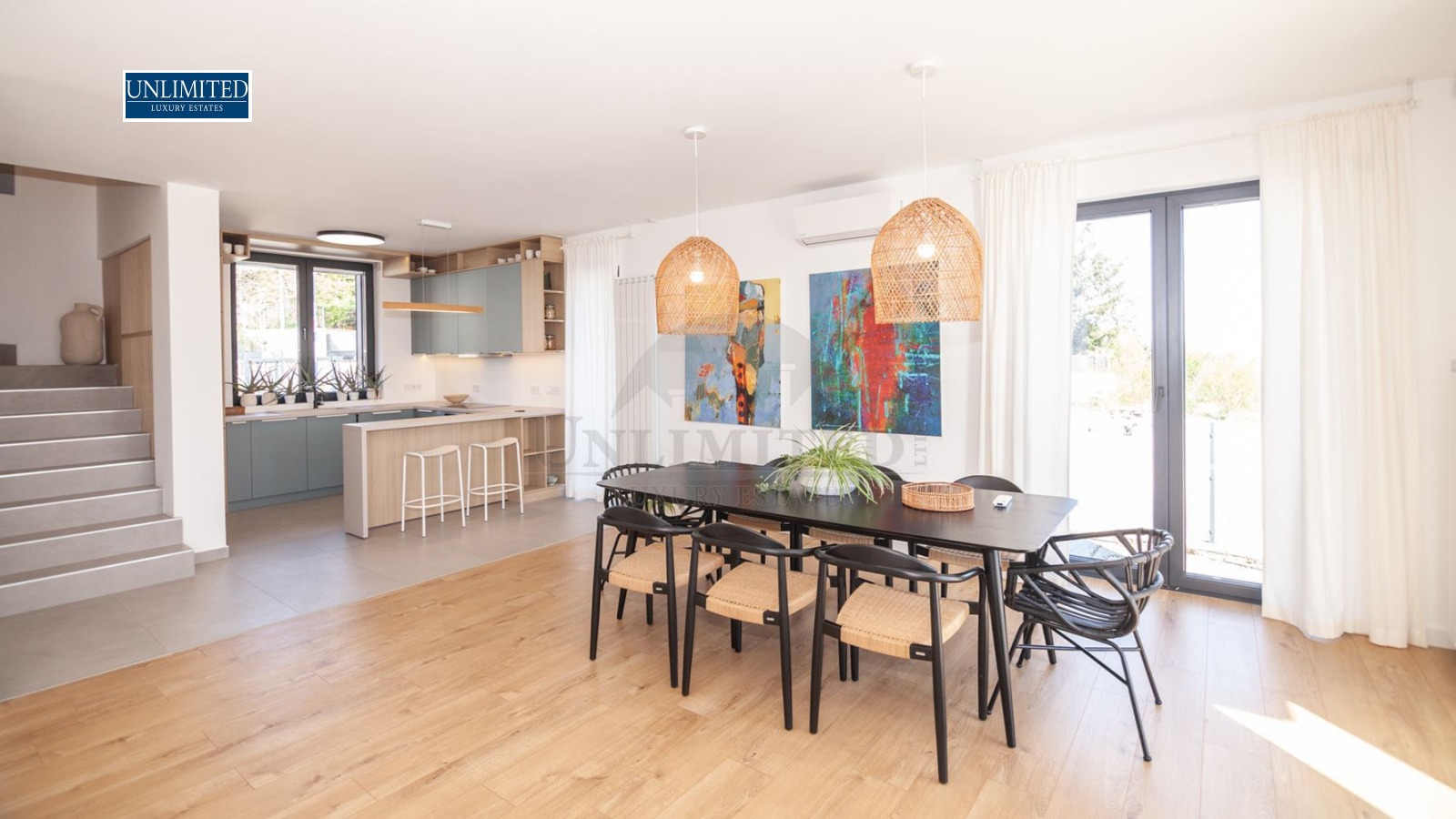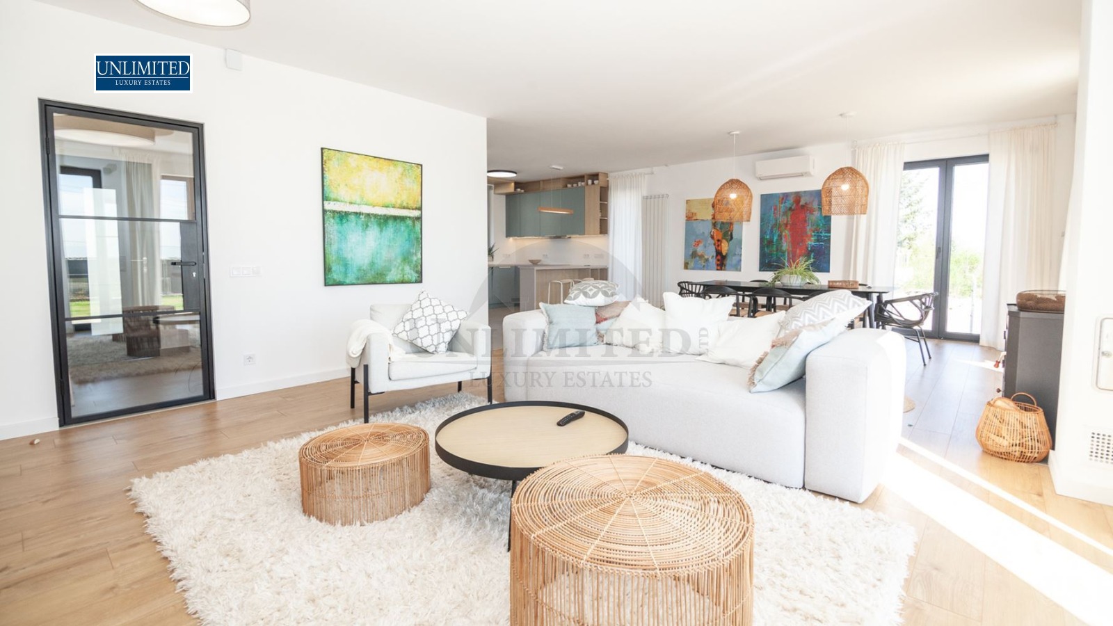 Имотът впечатлява с съвременна архитектура, стилен интериор и функционално разпределение, създадено за максимален комфорт и уют. Пространствата са изпълнени с естествена светлина благодарение на големите френски прозорци, а интериорът е завършен с внимание към детайла и висок клас материали.