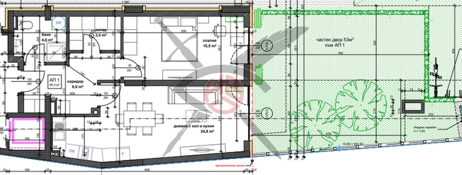 РАЗПРЕДЕЛЕНИЕ: Жилището разполага с чиста жилищна площ от 81 кв.м. разпределена във входно антре, просторен хол с кухня, спалня, баня с тоалетна,склад и огромен частен двор към апартамента/ 53 кв.м./
