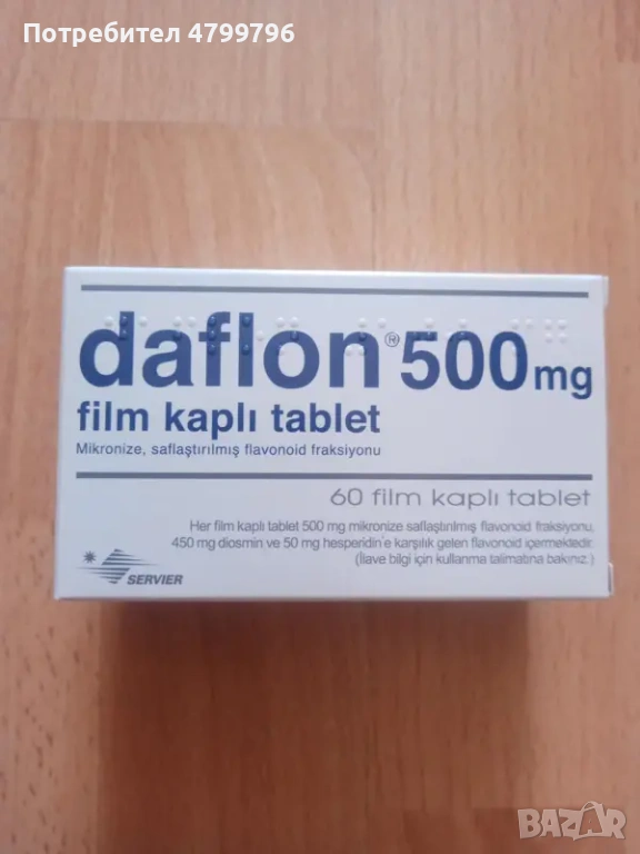 НАЛИЧЕН: ДАФЛОН 500 мг. 60 ТАБЛЕТКИ. Подобрява венозния тонус и устойчивостта на малките кръвоносни съдове. Дафлон е венотоник (повишава венозния тонус) и вазопротектор (повишава устойчивостта на малките кръвоносни съдове). Дафлон се препоръчва за симптоматично лечение на венозно-съдови нарушения (отекли крака, болка, изморени крака) и за симптоматично лечение при остри хемороидални кризи. Как се използва: При венозна недостатъчност – две таблетки дневно – по една таблетка на обяд и вечер, по време на хранене; При хемороиди – 4-дневен курс от 6 таблетки дневно, последвани от по 4 таблетки дневно през следващите 3 дни, по време на хранене.