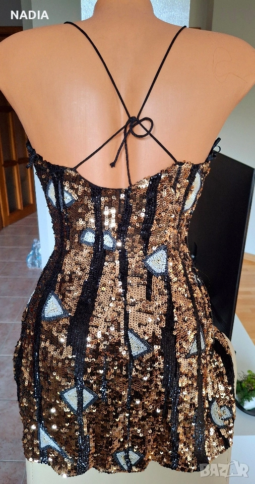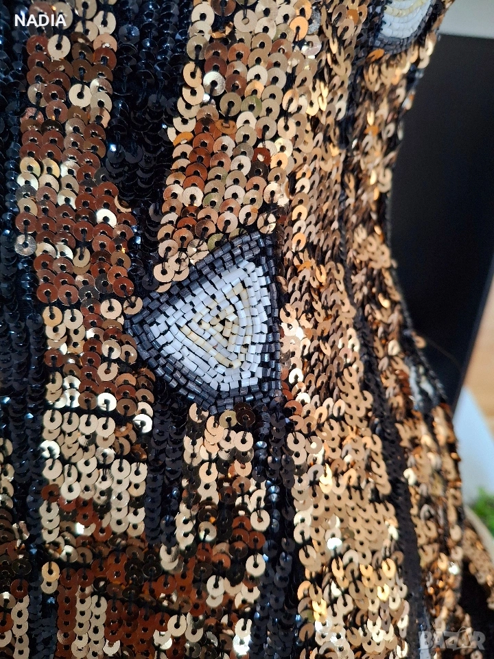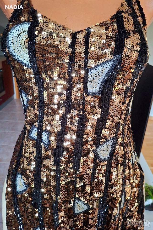 Къса рокла с пайети и мъниста, истинско бижу. Дължина с презрамките 77, бюст 40, талия 34, ханш 46. Има еластичност и подплата от трико.