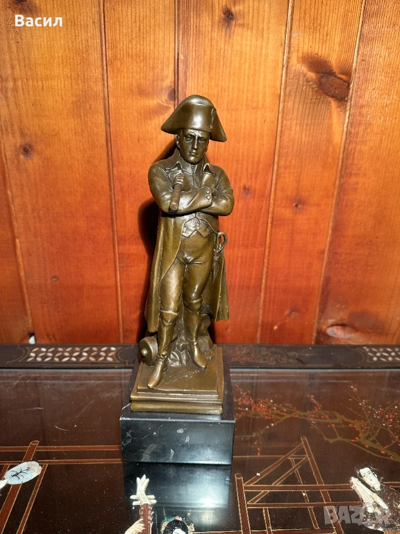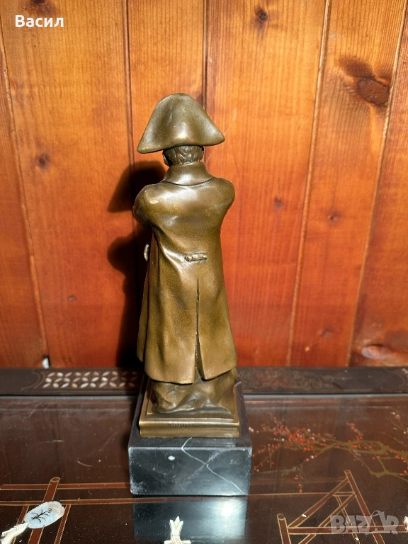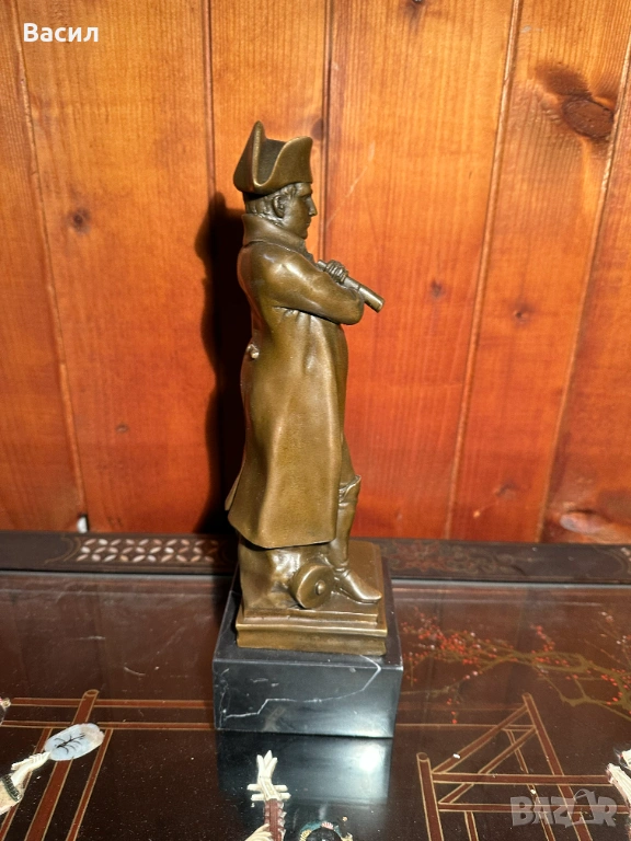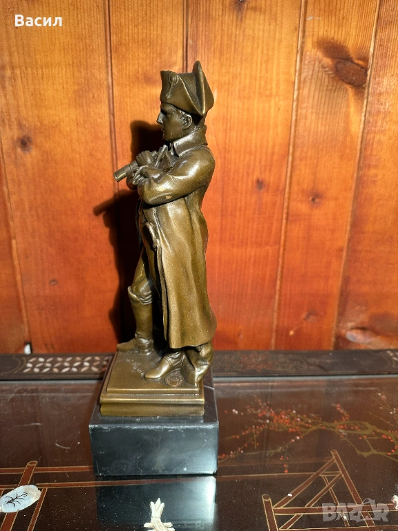 Впечатляваща винтидж бронзова скулптура на Наполеон Бонапарт, изработена и поставена върху полирана основа от черен мрамор. Фигурата го представя в емблематична поза с кръстосани ръце, във военна униформа с двурогата шапка, застанал до оръдейно гюле.