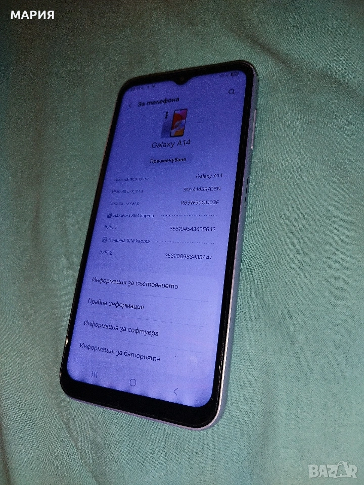 Технически характеристики Мрежа LTE/3G/2G Батерия Li-Po Капацитет на батерията 5000mAh Работа с 2 сим карти Да Тип SIM Nano SIM (4FF) Корпус Широчина 78мм Дебелина 9.1мм Височина 167.7мм Тегло 202гр Защитно покритие на дисплея Стъкло Покритие на заден капак Пластмаса Рамка Пластмаса Прахо/Водоустойчивост Не Камера Брой задни камери Три Основна камера 50MP Характеристики на основна камера f/1.8, PDAF Светкавица LED Видеорезолюция 1080p Втора камера 5MP Характеристики на втора камера f/2.2 (ултраширок) Трета камера 2MP Характеристики на трета камера f/2.4 (дълбочина) Предна камера 13MP Памет и чипсет RAM памет 4GB, 6GB, 8GB Вградена памет 64GB, 128GB Слот за памет microSD Процесор Exynos 1330 (5nm) - SM-A146B, Mediatek MT6833 Dimensity 700 (7 nm) - SM-A146P Брой процесорни ядра 8 Тактова честота 2.4GHz, 2GHz Графичен ускорител Mali-G68 MP2 - SM-A146B, Mali-G57 MC2 - SM-A146P Дисплей Размер 6.6" Широчина 1080px Височина 2408px Тип PLS LCD Съотношение на дисплея 20:9 Честота на опресняване 90Hz Гъстота на пикселите 400ppi Съотношение дисплей:корпус 80.2% Софтуер Операционна система Android Версия на ОС 13, One UI Core 5 Комуникация GPS + A-GPS, GLONASS, GALILEO Wi-Fi 802.11 a/b/g/n/ac Bluetooth 5.2 NFC Да Други Сензори Акселерометър, Жироскоп, За близост, Компас Цветове Черен, Зелен, Червен, Сребрист Сензор за пръстови отпечатъци Да Звук 3.5 мм. жак Да Захранване Бързо зареждане 15W Порт за зареждане USB Type-C