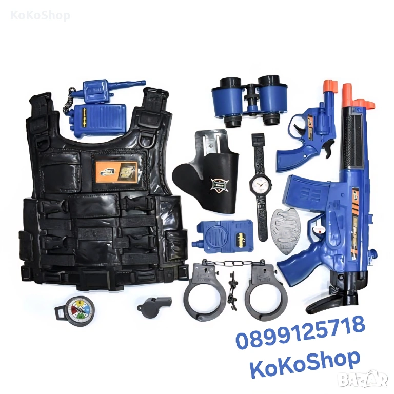 Детски полицейски комплект, който съдържа бронежилетка, пистолет с реалистични бойни звуци, оръжие, белезници, бинокъл, свирка, значка, компас, радиостанция и др.