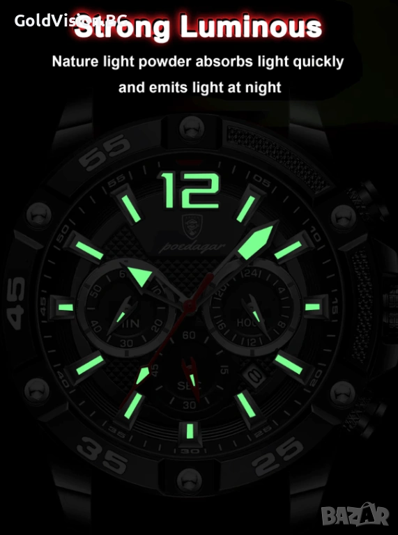 Мъжкият часовник POEDAGAR 912 е стилно предложение за мъже, които ценят комбинацията от спортен дух и елегантна визия. Този модел впечатлява с мощен и модерен дизайн, масивен корпус и функционалност, която го прави идеален както за ежедневна употреба, така и за динамични ситуации.