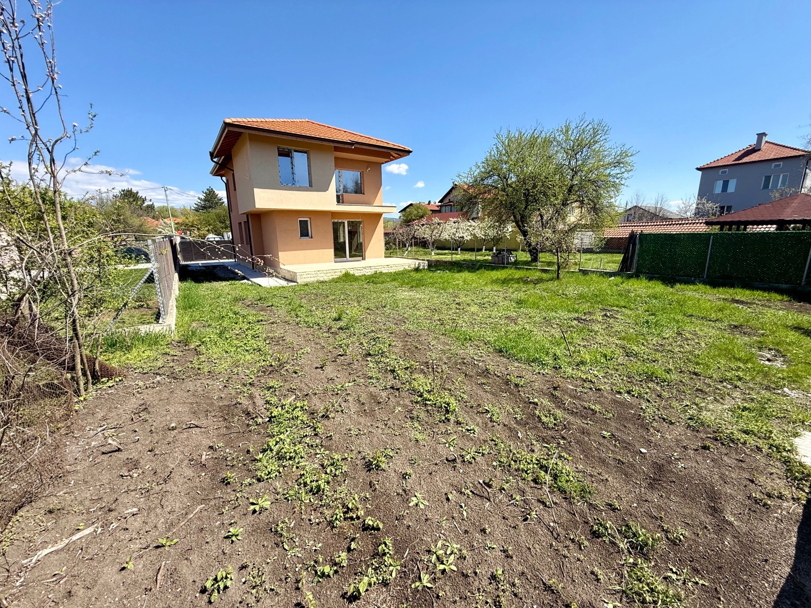 Излятите бетонни площадки около къщата дават отлична база за алеи, барбекю зона или паркоместа.