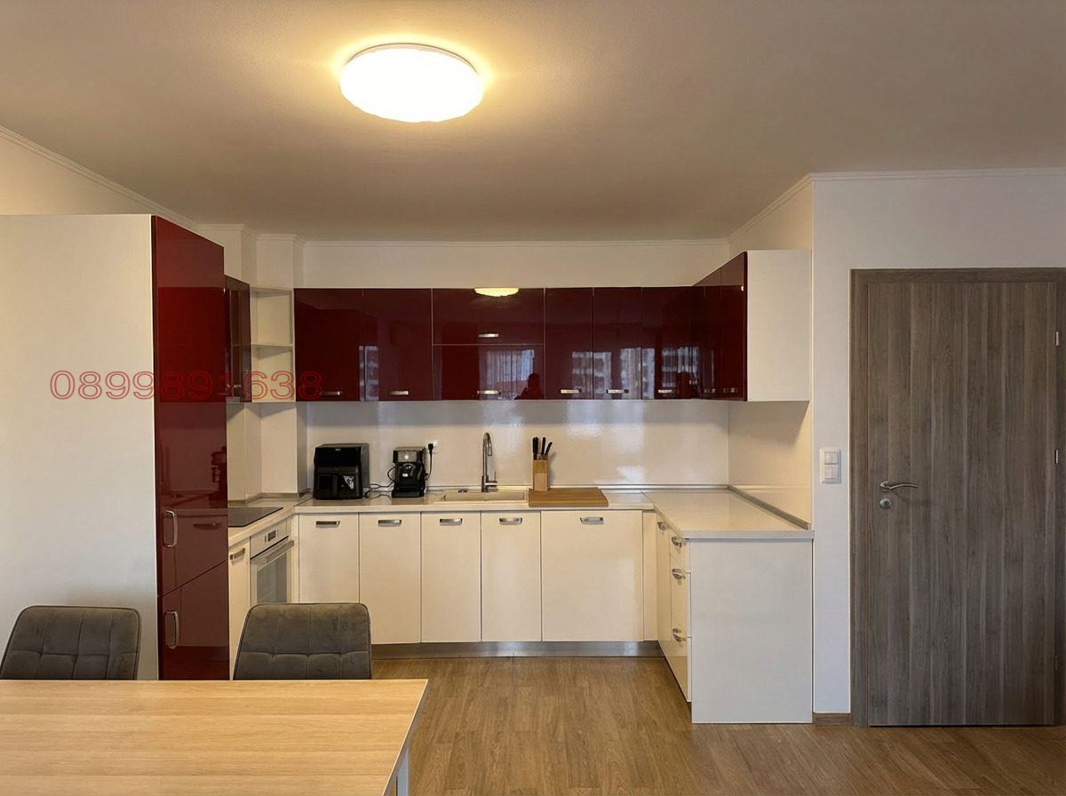 Кухня по поръчка, материали висок клас. Вградени уреди: хладилник, фурна, котлони/плот, съдомиялна. Пералнята е отделно.