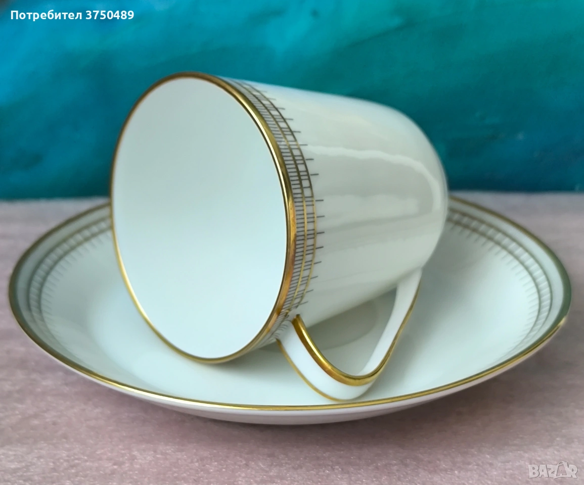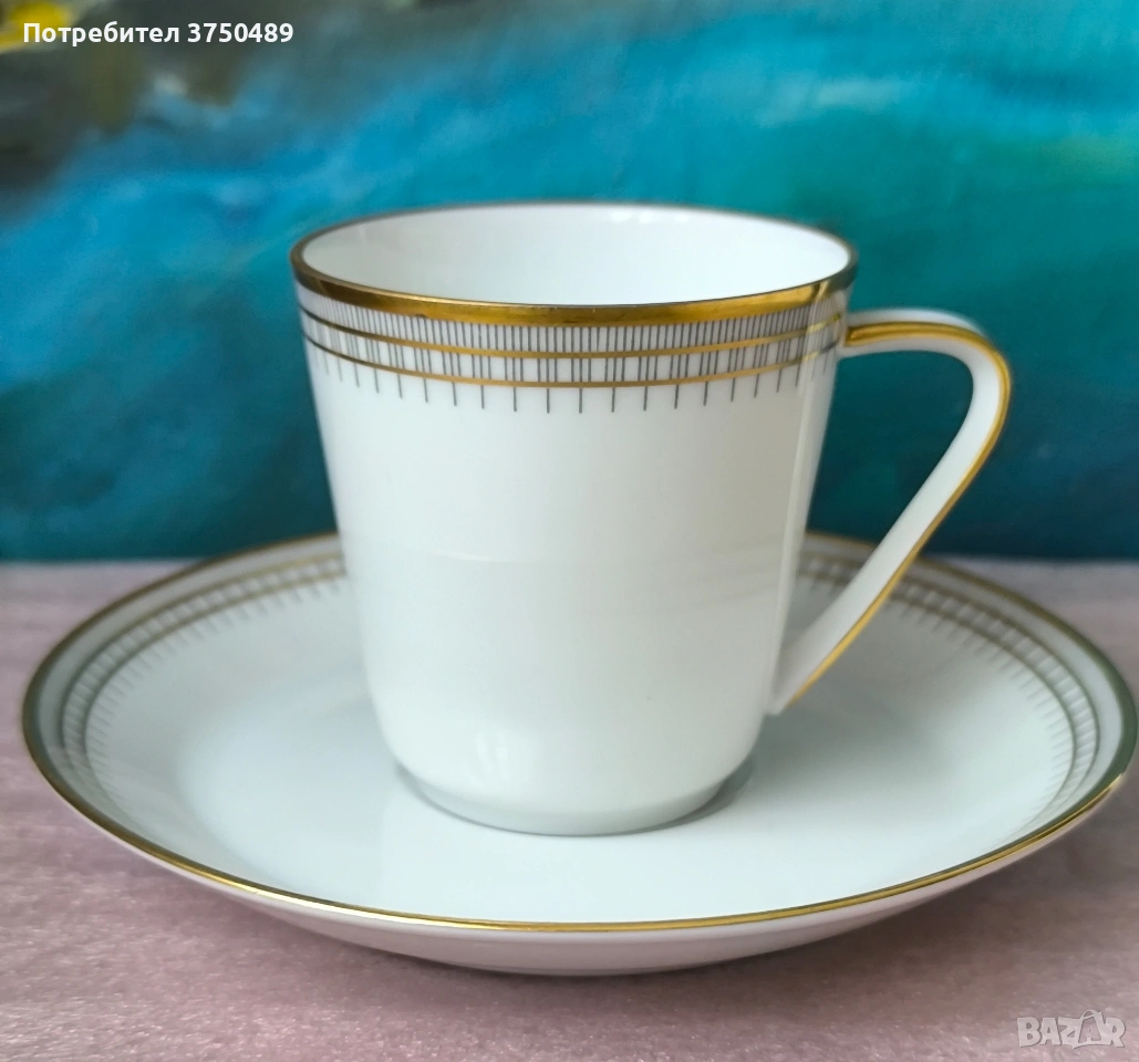 Изящен порцеланов сервиз за кафе с елегантен златист декор.Изработен от фин бял порцелан от немската компания Hutschenrruther -Bavaria.
