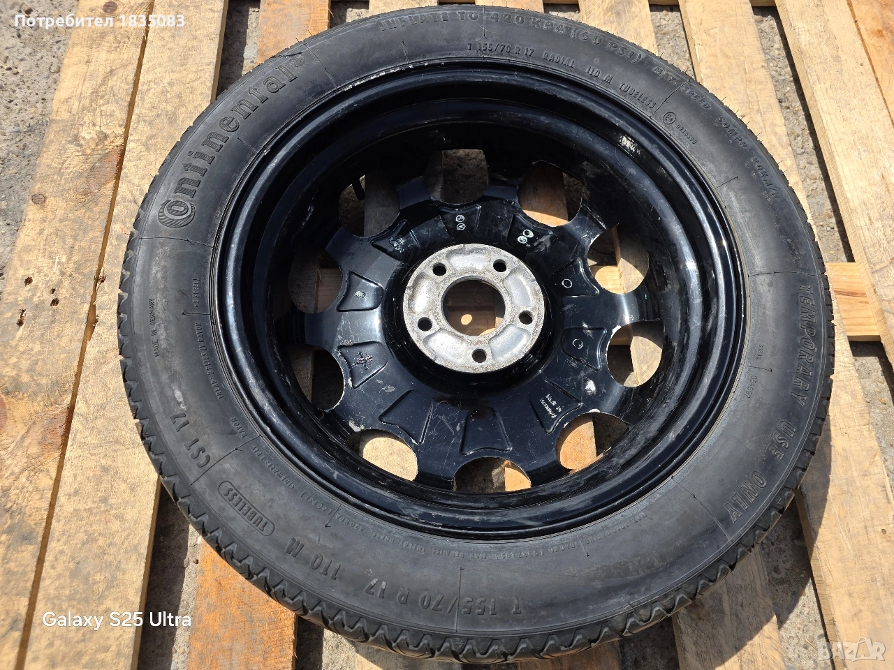 Продавам оригинална резервна гума тип патерица за Мерцедес с размери 17" 5х112 4J ET34 ЦО66.6мм. с гума Continental 155/70/17.