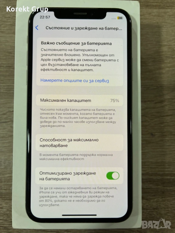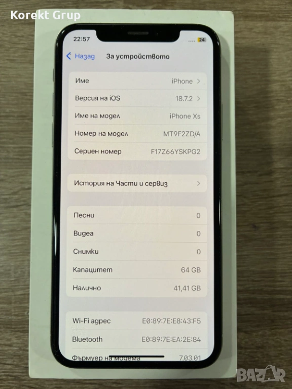 Продавам iPhone XS с вътрешна памет от 64GB. Устройството е в отлично състояние и е готово за употреба. Батерията на телефона е 74% като цяло устройството е в отлично визуално и техническо състояние.Може да се види на място за гр.Варна или да се изпрати по Еконт с преглед и тест.