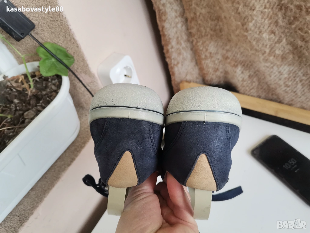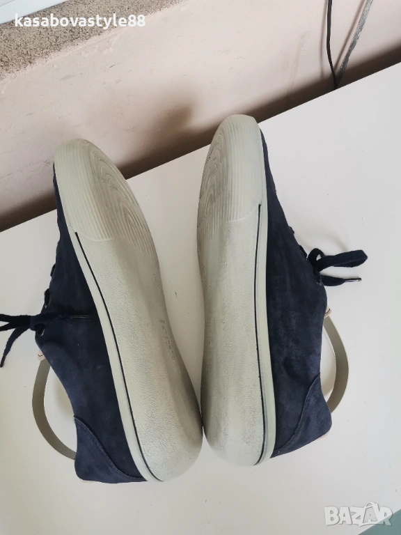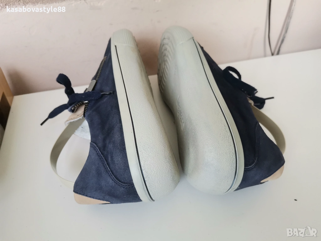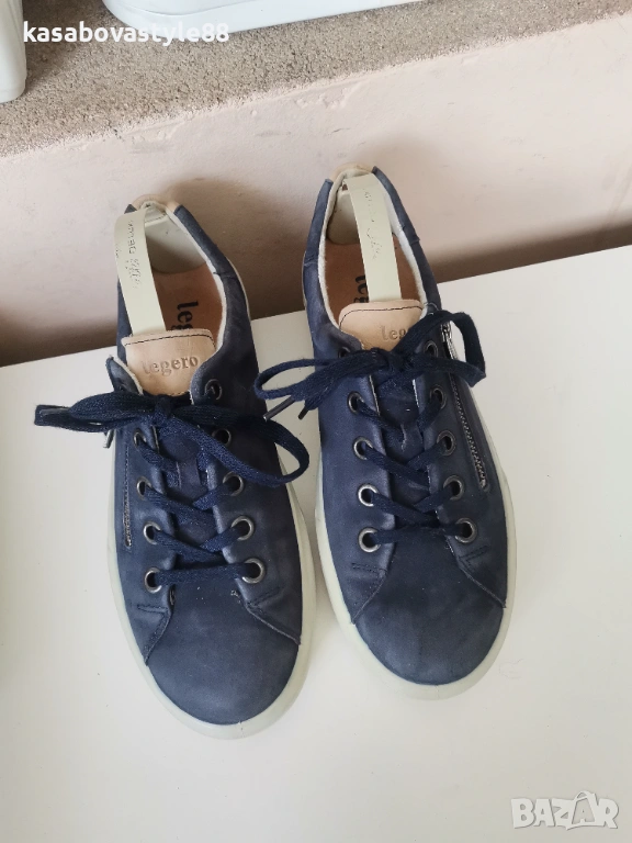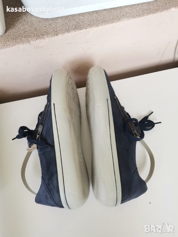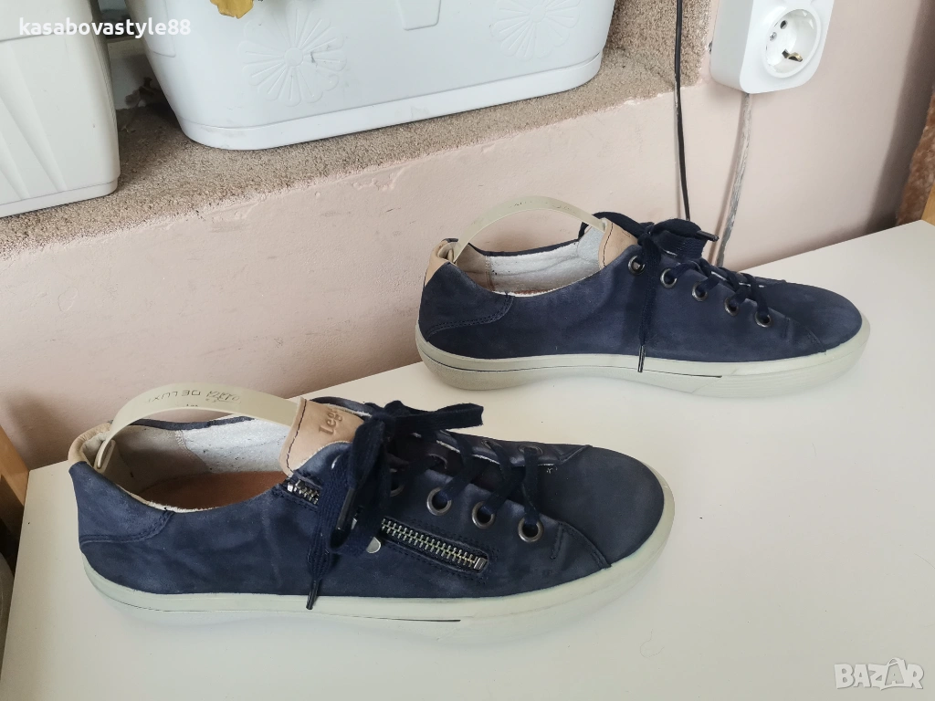 Дамски виаококачествени сникърси от немската марка Legero Изработени от тъмно-син естествен велур в отлично състояние!! Те са известни със в своята лекота и комфорт Ходилото е ултра гъвкаво с височина отзад 3см.Подплатата отвътре е от текстил, а стелката от естествен материал, която при нужда може да се вади. Разполагат с удобни връзки, както и ципове. Дължина на стелка 25.6см.Цялостна височина отзад 9см.