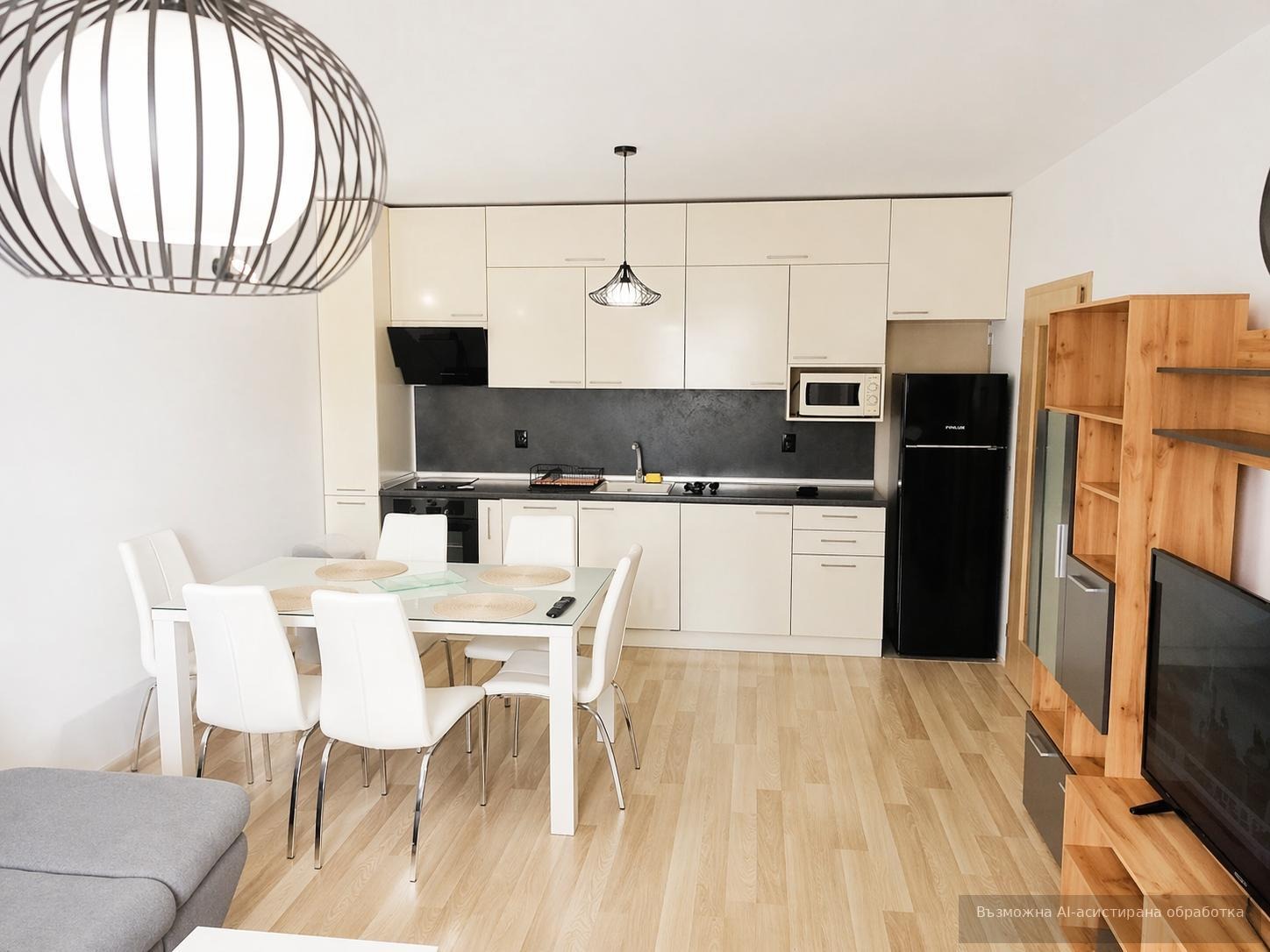 Разпределението включва хол с кухненски бокс, спалня, баня с тоалетна и тераса. Апартаментът е обзаведен, отоплява се на ток и е оборудван с климатик.