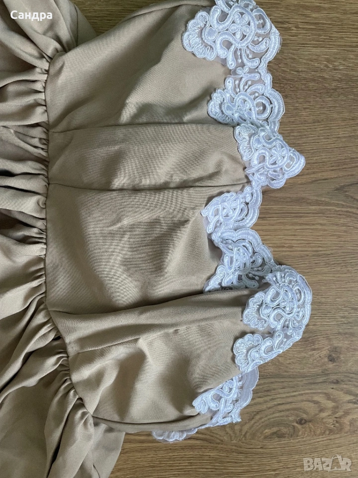 Роклята е в бежов цвят, отпред е къса в задната си част е дълга до долу, има страхотна бяла дантела, закупена е от Англия, само пробвана, цената е такава, защото клиент развали ципа!