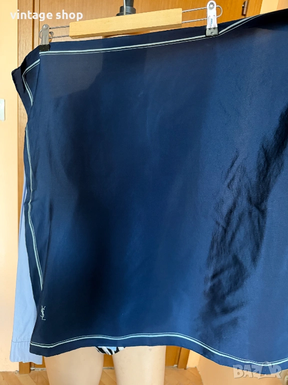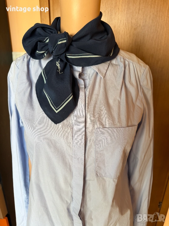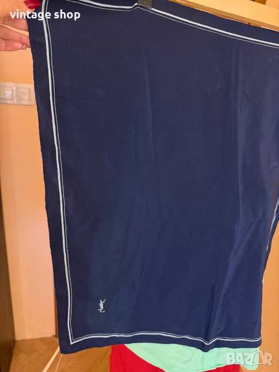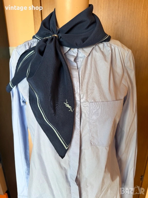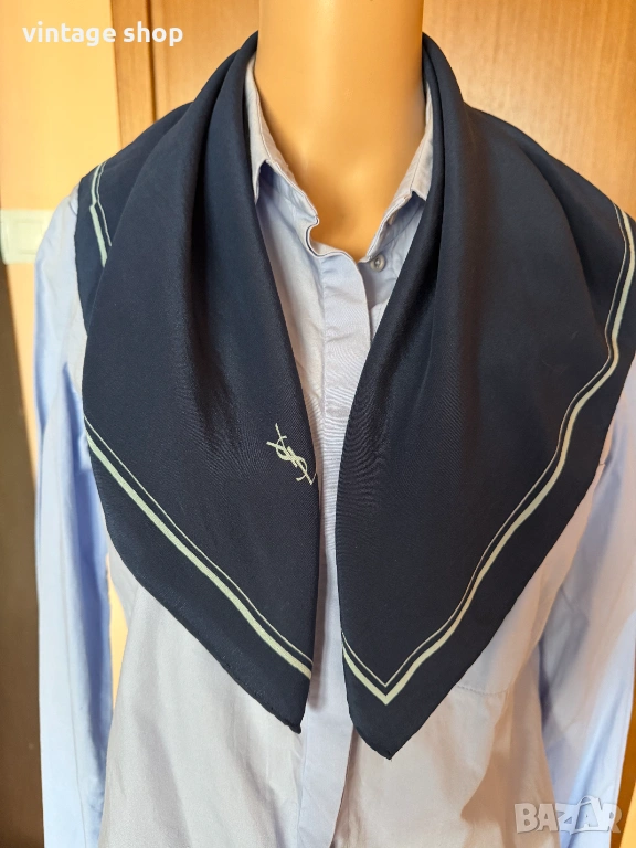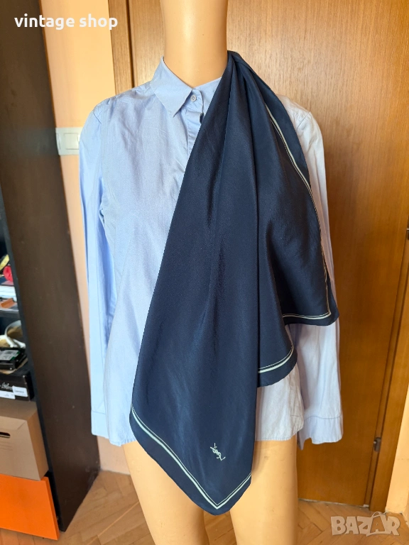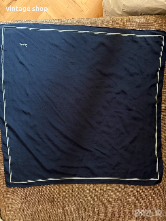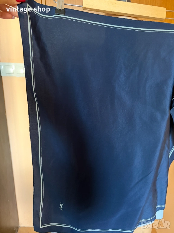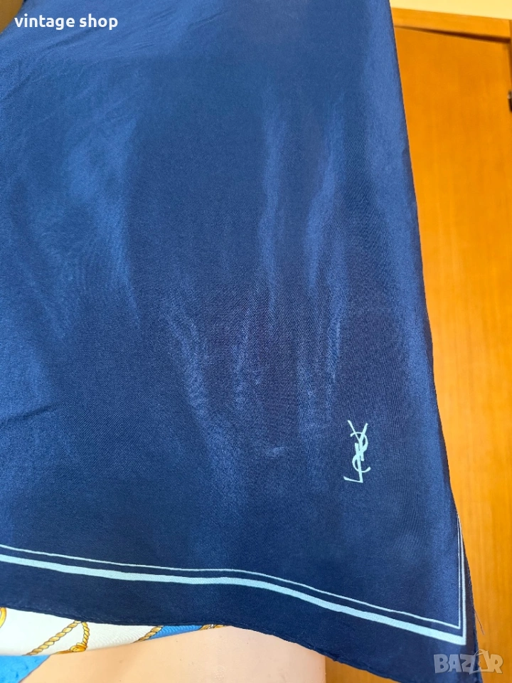 Копринен шал на Yves Saint Laurent с изчистен десен и ненатрапчив лукс. Основната тоналност е тъмносияна със свтелосин кант, обкантващ долната част на шала. Лого на бранда в светлосин цвят.