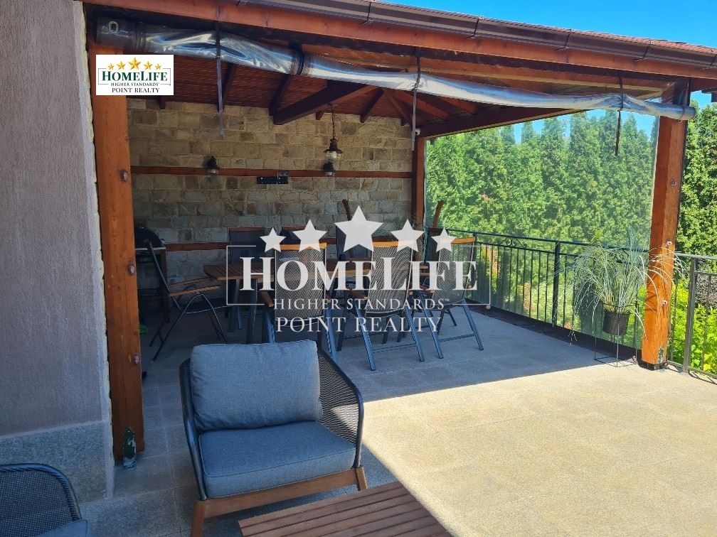 1 етаж: кухня с трапезария и просторна всекидневна с камина и излаз на голяма тераса с два обособени къта, единия с масивен дървен навес, подходящ за целогодишно използване,