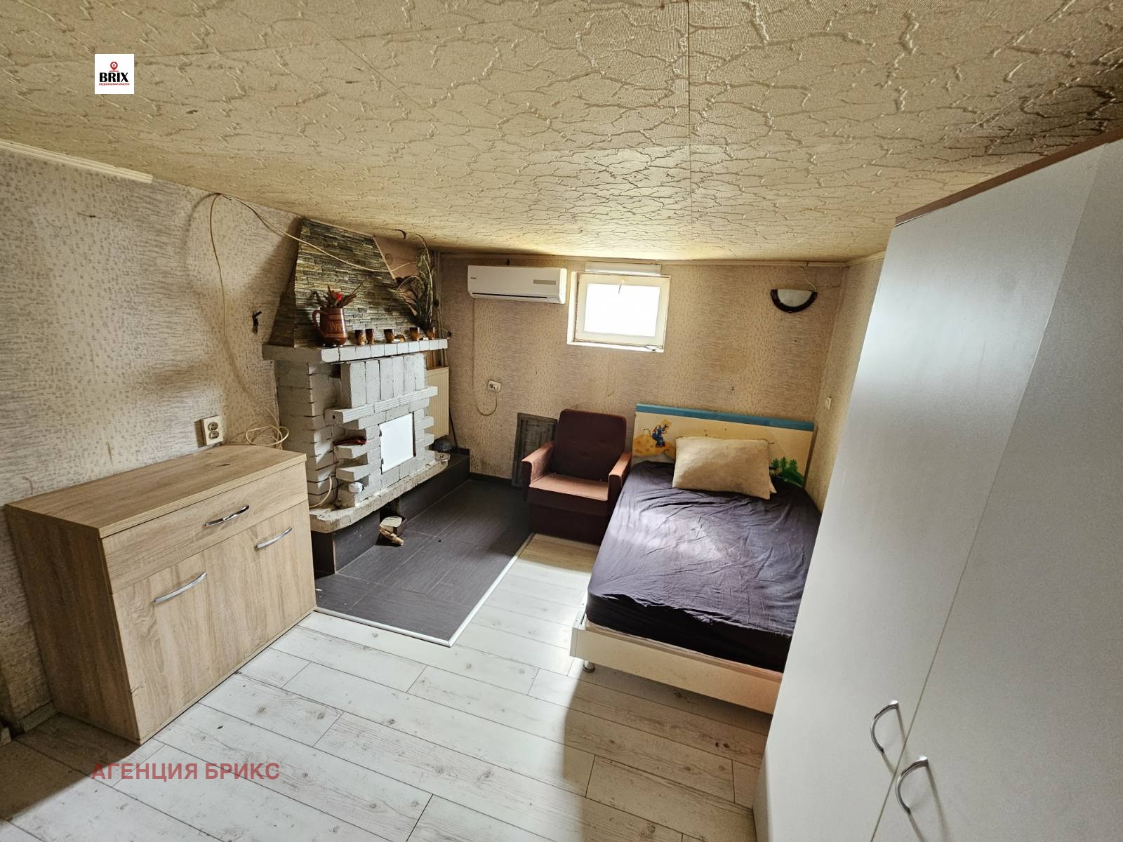 Основния етаж е с обособени детска спалня, просторен хол, кухненска част с обособен кът за родителска спалня и общ санитарен възел.