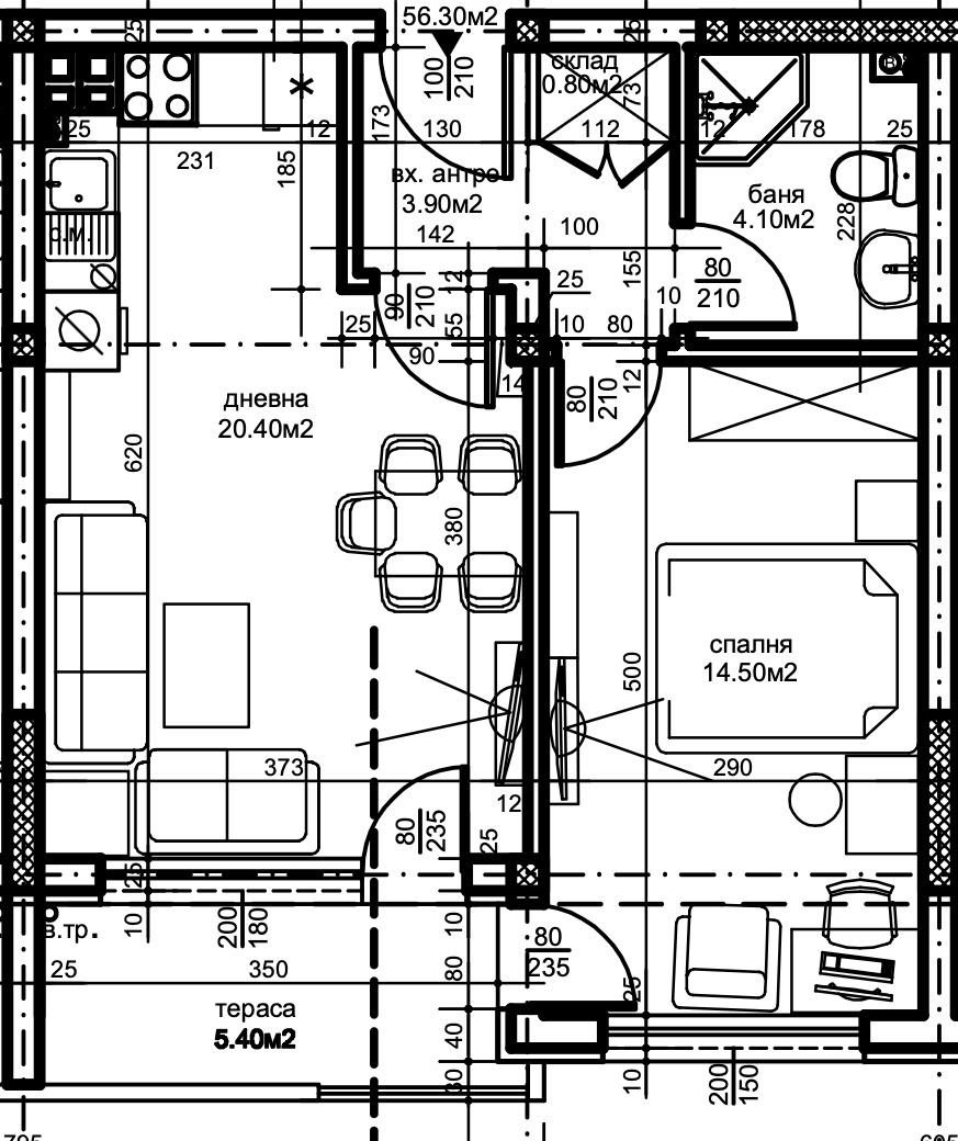 ➡ Апартаментът се състои се от антре, дневна с трапезария, спалня, склад, баня с тоалетна и е с обща площ от 64 кв.м. Изложение - юг.
