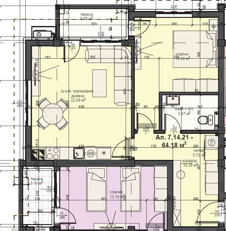 Апартамент 7. в блок C е ситуиран на 2-ри от 4-ти жилищен етаж и разполага с площ от 73 кв.м., разгърната по следния практичен начин: коридор, светла и просторна дневна с кухненски бокс, спалня, баня с тоалетна, тераса. Отоплението е електическо. Сградата разполага с асаньор.