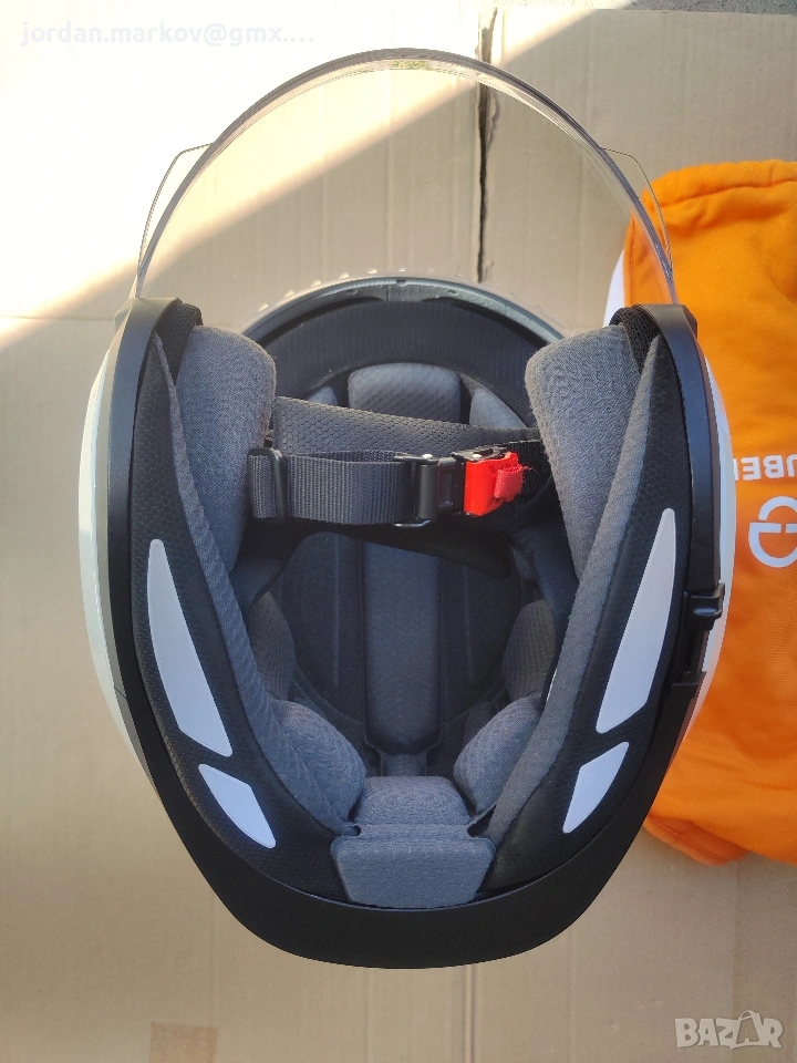Няколко пъти използвана каска за мотоциклет, почти нова, с комуникатор. Размер XL 61 см.