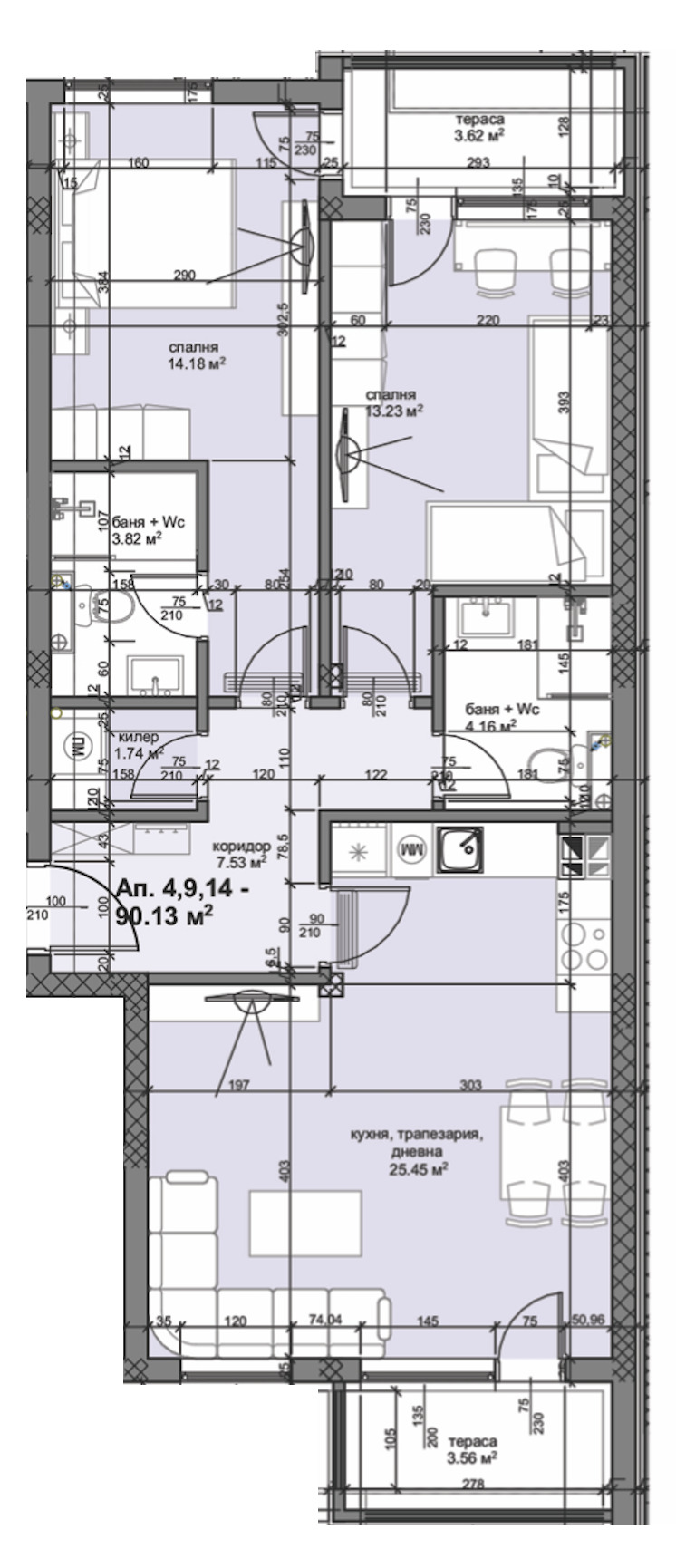 ➡Имотът се състои от коридор, 2 бани с тоалетна, килер, 2 спални, дневна с кухня и трапезария, 2 тераси и е с обща площ от 106,49 кв.м. Изложение - юг, север!