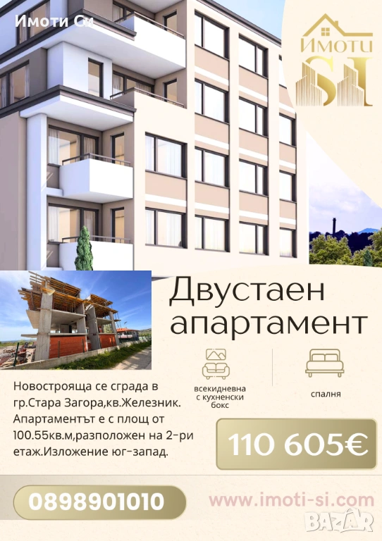 'Имоти Си' продават двустаен апартамент в новострояща се сграда в гр.Стара Загора,кв.Железник.Апартаментът се намира на 2-ри етаж с площ 100.55кв.м.