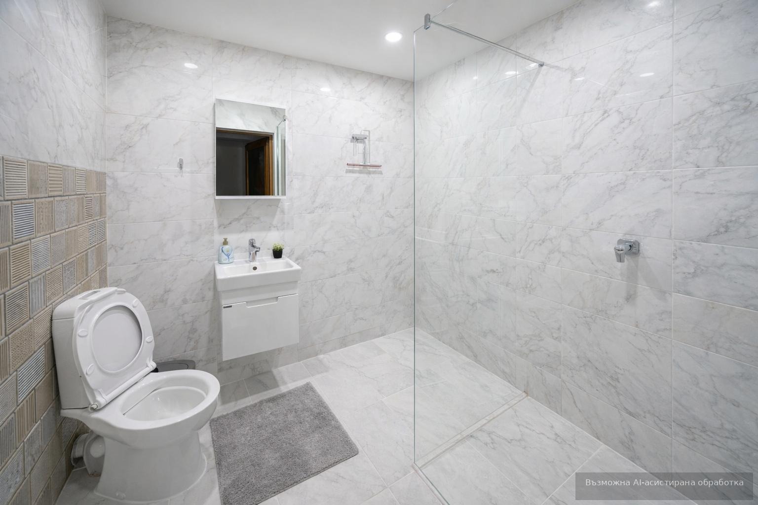 Имотът е ситуиран на 1-ви жилищен етаж и разполага с площ 55кв.м, разгърната в следното разпределение: входно антре, хол с кухненски бокс и трапезария, спалня, баня с тоалетна и тераса.