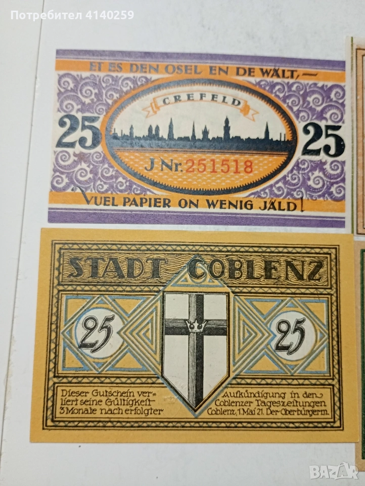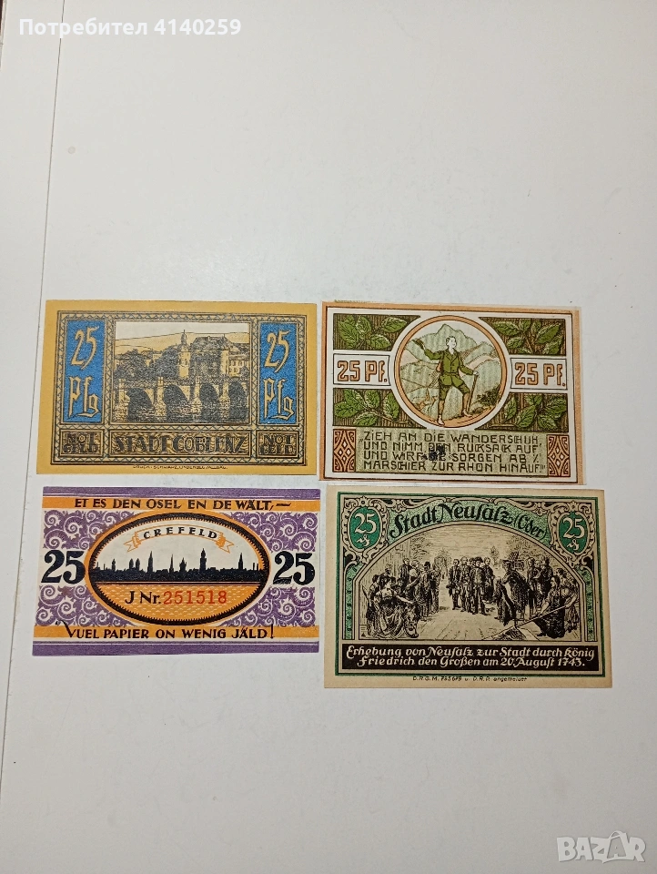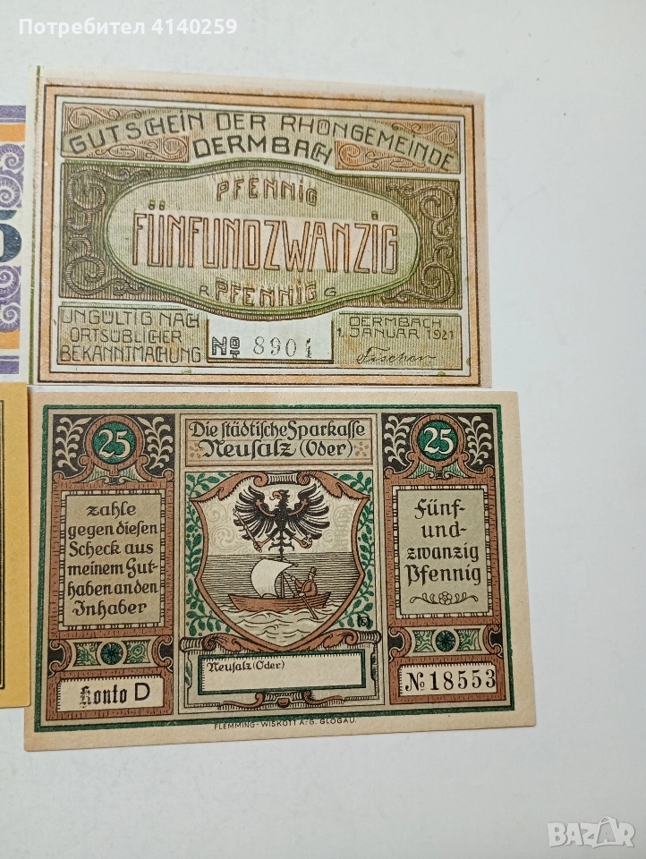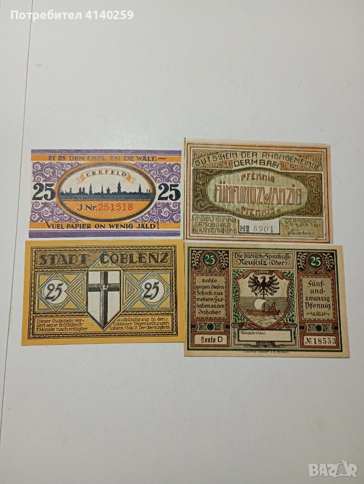 ГЕРМАНИЯ БАНКНОТИ ТИП НОТ ГЕЛ СПЕШНИ ПАРИ 25 ПФЕНИГА ГРАД НОЙЗАЛЦ 1922 Г 25 ПФЕНИГА ГРАД ДЕРМБАХ 1921 Г 25 ПФЕНИГА ГРАД КОБЛЕНЦ 1921 Г 25 ПФЕНИГА ГРАД КРЕФЕЛД 1921 Г СЪСТОЯНИЕ НОВО ЦЕНА ЗА 4 БРОЯ ПОЛУЧАВАТЕ СНИМАНИТЕ БАНКНОТИ РАЗГЛЕДАЙТЕ ДРУГИТЕ МИ ОБЯВИ ДА КОМБИНИРАТЕ ДОСТАВКА ЕКОНТ ЗА ВАРНА ЛИЧНО