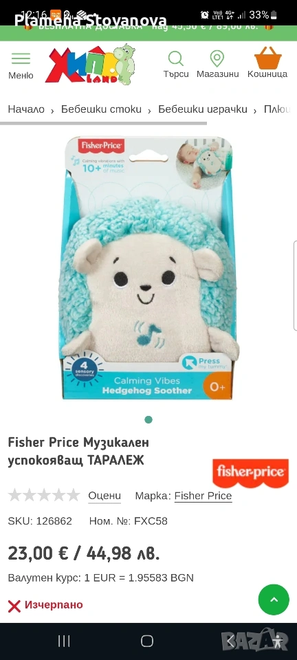 Нова играчка таралеж на фишерпрайс. Цента в България, нова е около 40 лева средно, аз я продавам за 15 евро