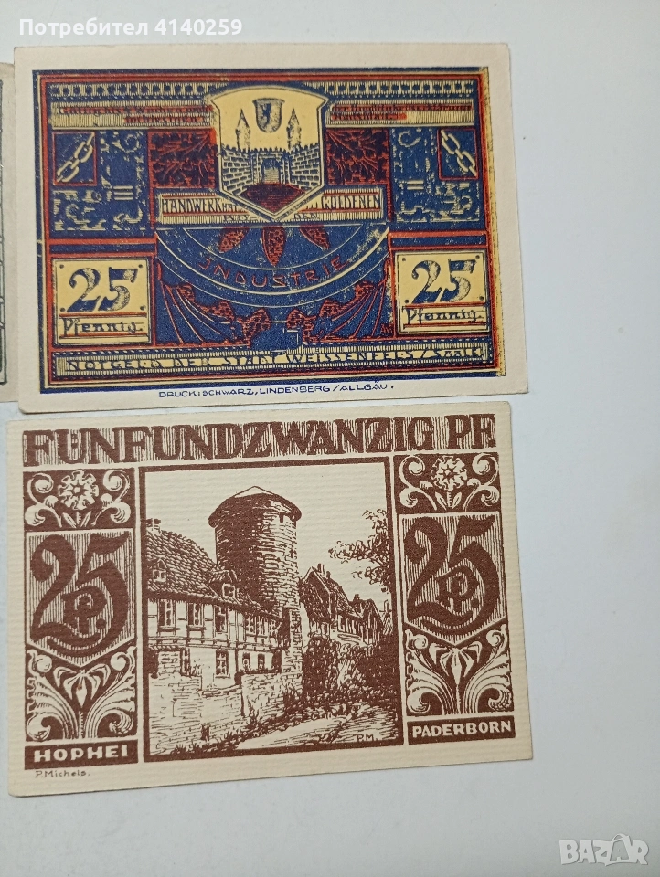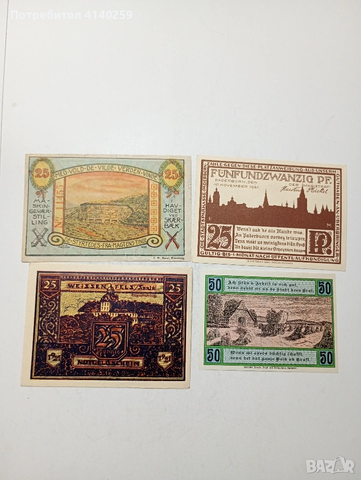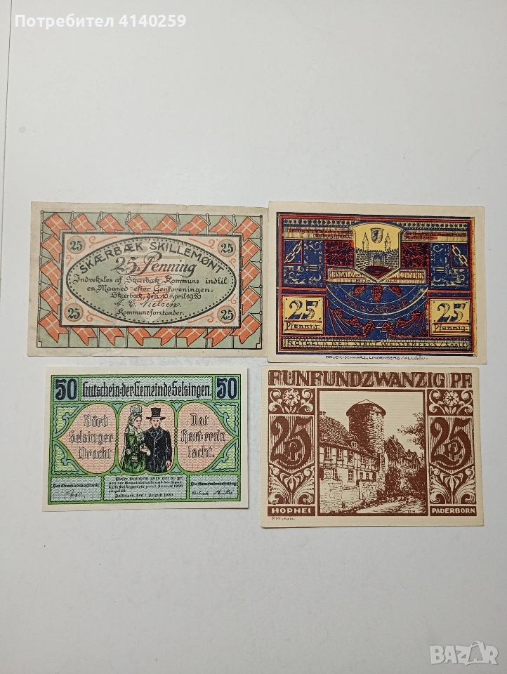 ГЕРМАНИЯ БАНКНОТИ ТИП НОТ ГЕЛ СПЕШНИ ПАРИ 25 ПФЕНИГА ГРАД СКЬОРБЕК 1920 Г 25 ПФЕНИГА ГРАД ВЕЙСЕНФЕЛС 1921 Г 50 ПФЕНИГА ГРАД ЗЕЛЗИНГЕН 1920 Г 25 ПФЕНИГА ГРАД ПЕДЕРБОРН 1921 Г СЪСТОЯНИЕ НОВО ЦЕНА ЗА 4 БРОЯ ПОЛУЧАВАТЕ СНИМАНИТЕ БАНКНОТИ РАЗГЛЕДАЙТЕ ДРУГИТЕ МИ ОБЯВИ ДА КОМБИНИРАТЕ ДОСТАВКА ЕКОНТ ЗА ВАРНА ЛИЧНО