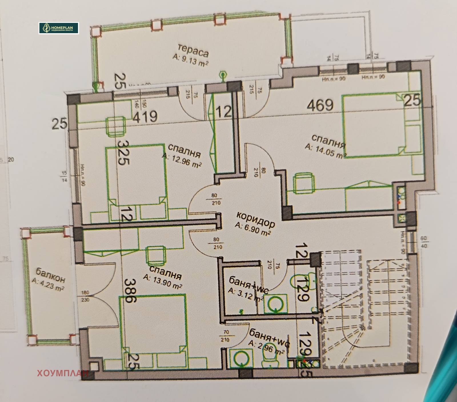 Втори етаж 3 спални, 2 бани с тоалетни, като едната е родителска със собствена баня и тоалетна, 2 тераси.