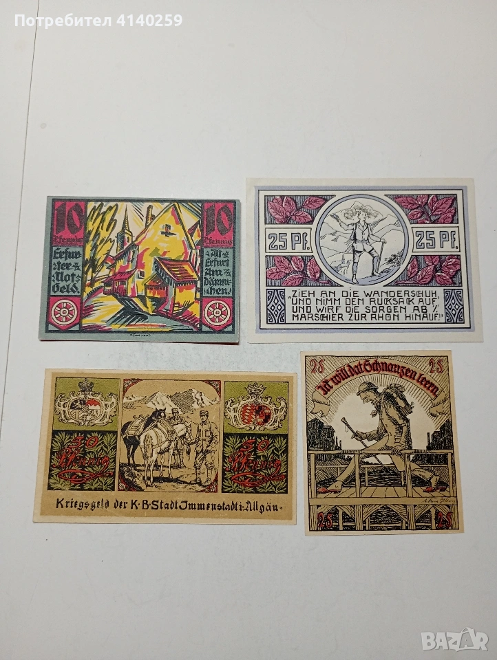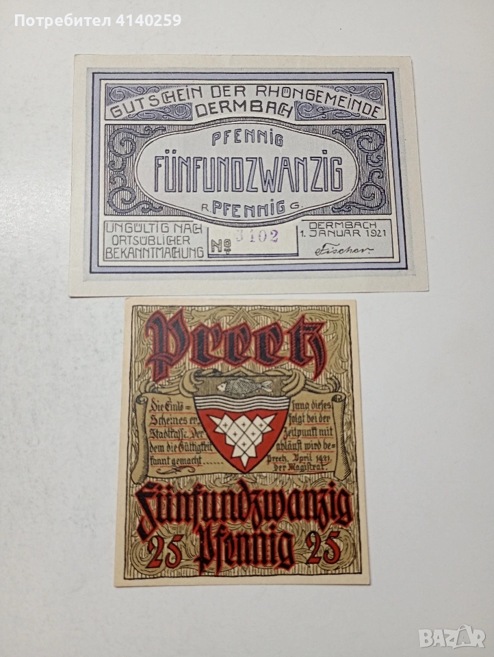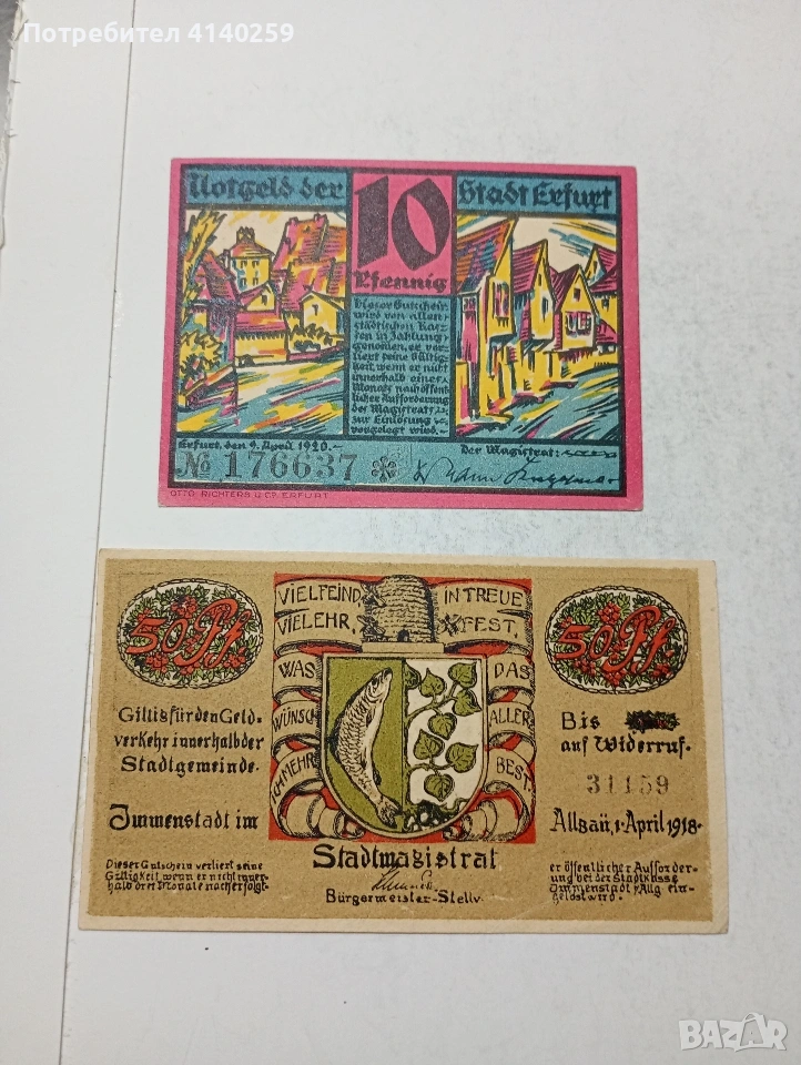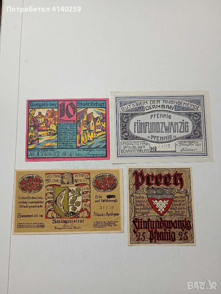 ГЕРМАНИЯ БАНКНОТИ ТИП НОТ ГЕЛ СПЕШНИ ПАРИ 50 ПФЕНИГА ГРАД ИМЕНЩАТ 1918 Г 25 ПФЕНИГА ГРАД ДЕРМБАХ 1921 Г 10 ПФЕНИГА ГРАД ЕРФУРТ 1920 Г 25 ПФЕНИГА ГРАД ПРЕЕЦ 1921 Г ЦЕНА ЗА 4 БРОЯ СЪСТОЯНИЕ НОВО ПОЛУЧАВАТЕ СНИМАНИТЕ БАНКНОТИ РАЗГЛЕДАЙТЕ ДРУГИТЕ МИ ОБЯВИ ДА КОМБИНИРАТЕ ДОСТАВКА ЕКОНТ ЗА ВАРНА ЛИЧНО