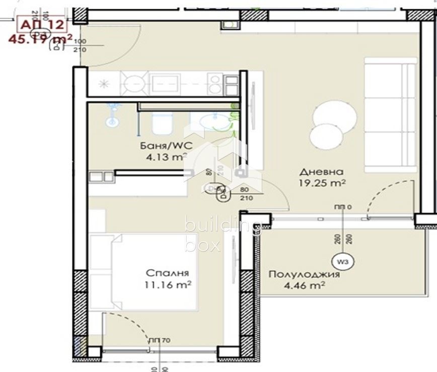 РАЗПРЕДЕЛЕНИЕ: Дневна с кухненски бокс, спалня, баня с тоалетна, входно антре и полулоджия.