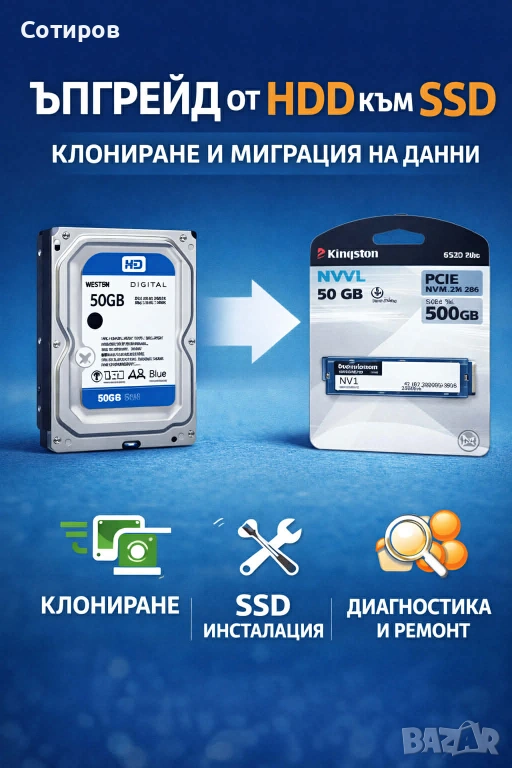 – Смяна на HDD със SSD (SATA, M.2 SATA, NVMe)