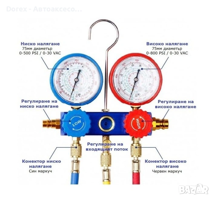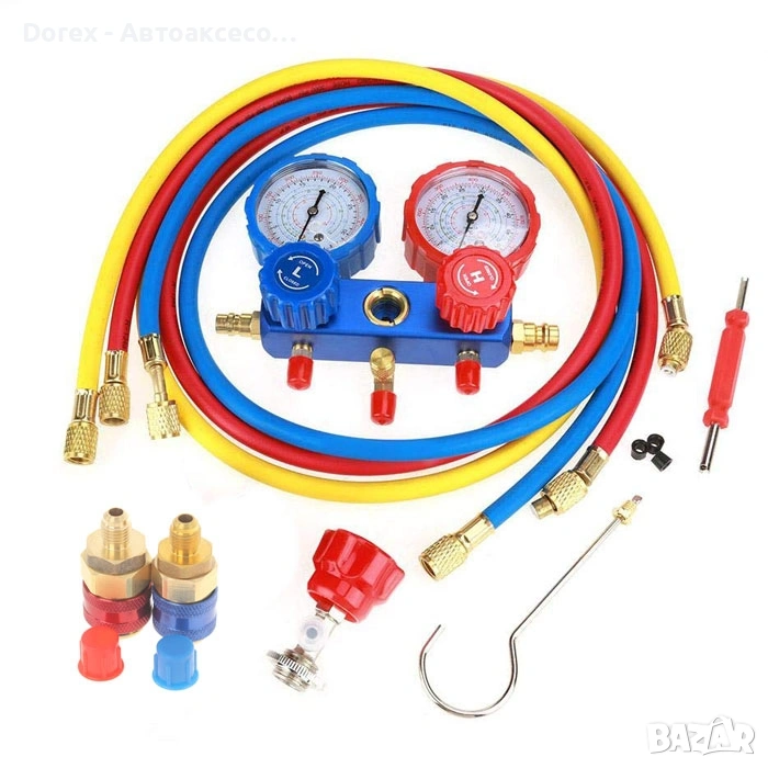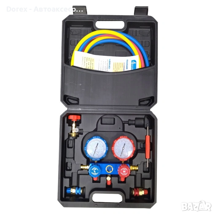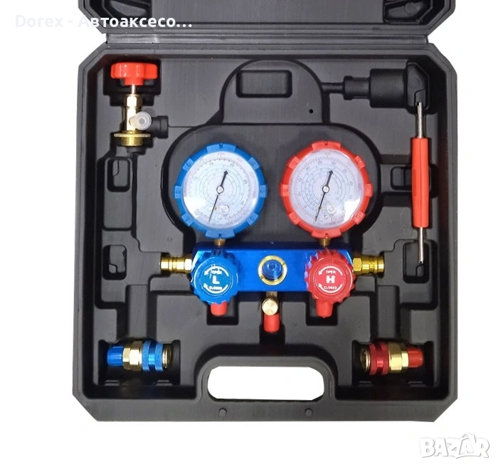 Двойният манометричен блок позволява прецизно измерване на високо и ниско налягане, което улеснява диагностика и зареждане на климатични системи. Изработен е с здрав корпус от алуминиева сплав, осигуряващ дълъг живот и устойчивост при професионална употреба.
