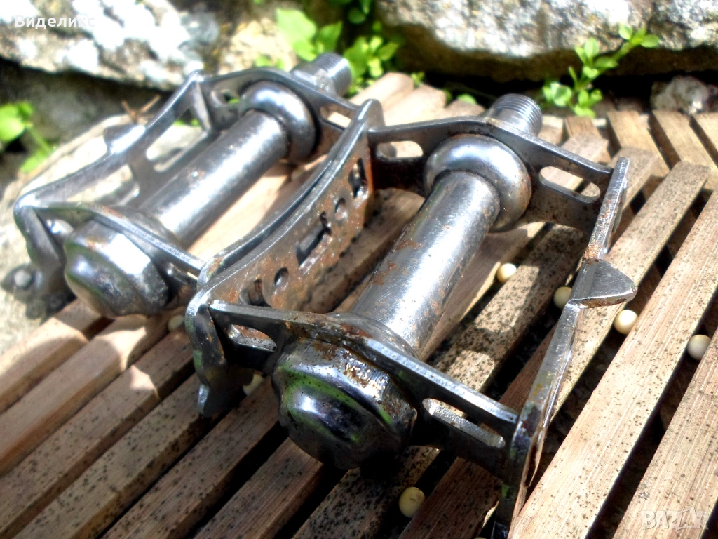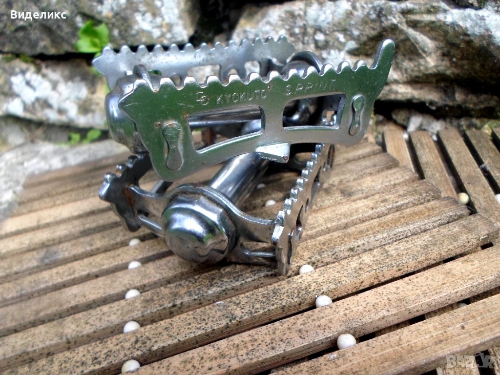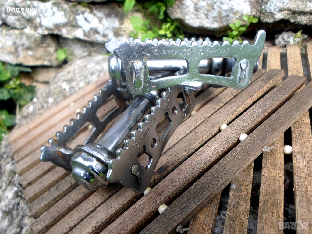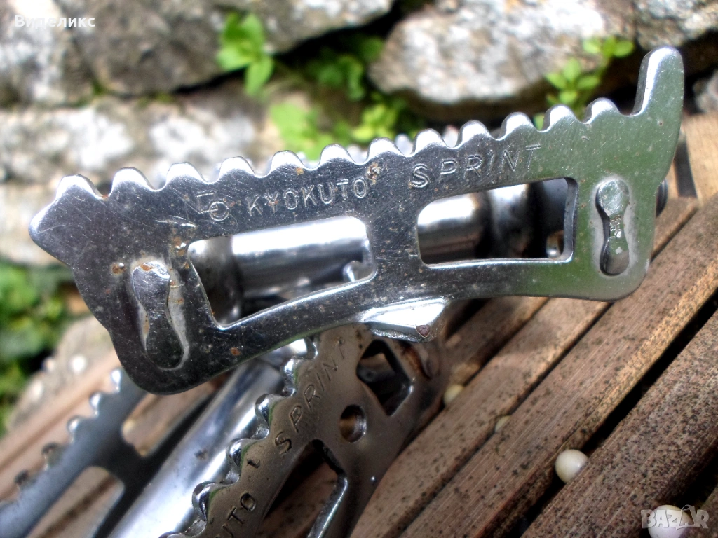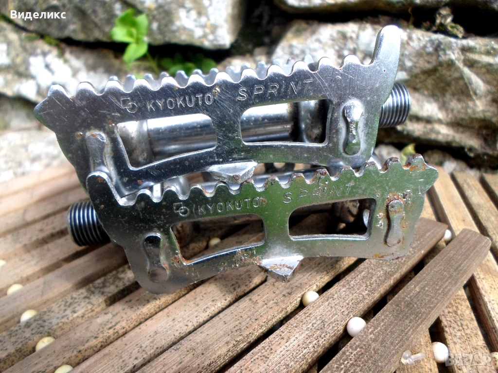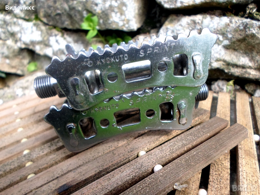 Kyokuto/KKT/Sprint ретро педали. Не намирам информация в нета за тях, останаха ми от ретро шосейка/с куки и каишки/, но са с тясна клетка стават и за пистови/и за градски велосипеди/. Единствената забележка е на последната снимка, клетката на единия педал от вътрешната страна има ръжда.