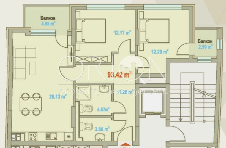Жилището е с обща площ от 93 кв.м. и разпределение: