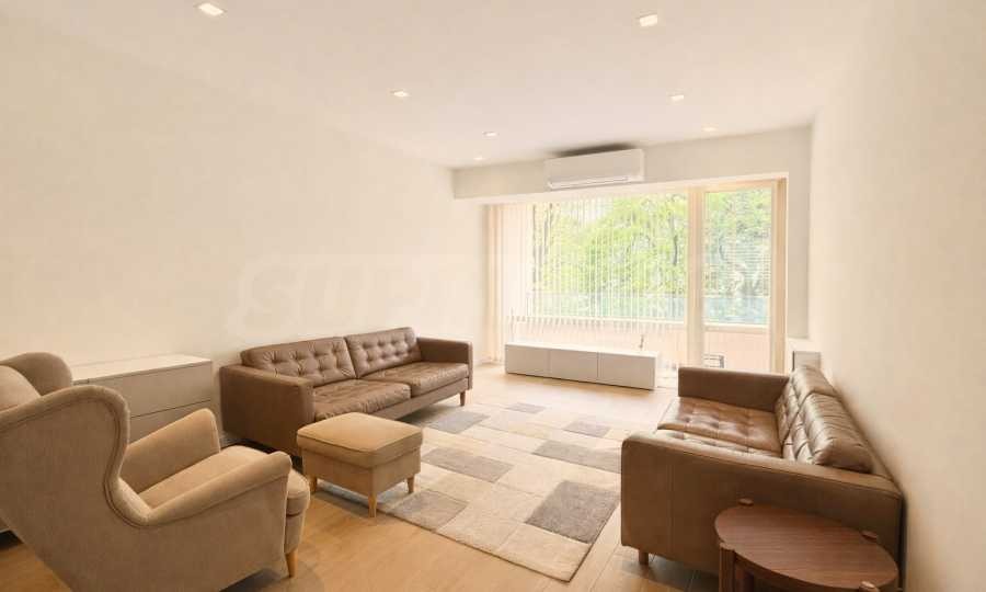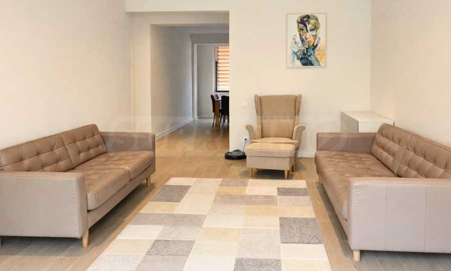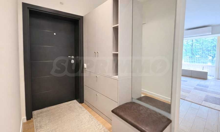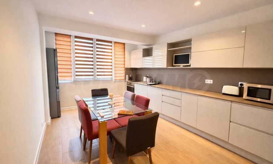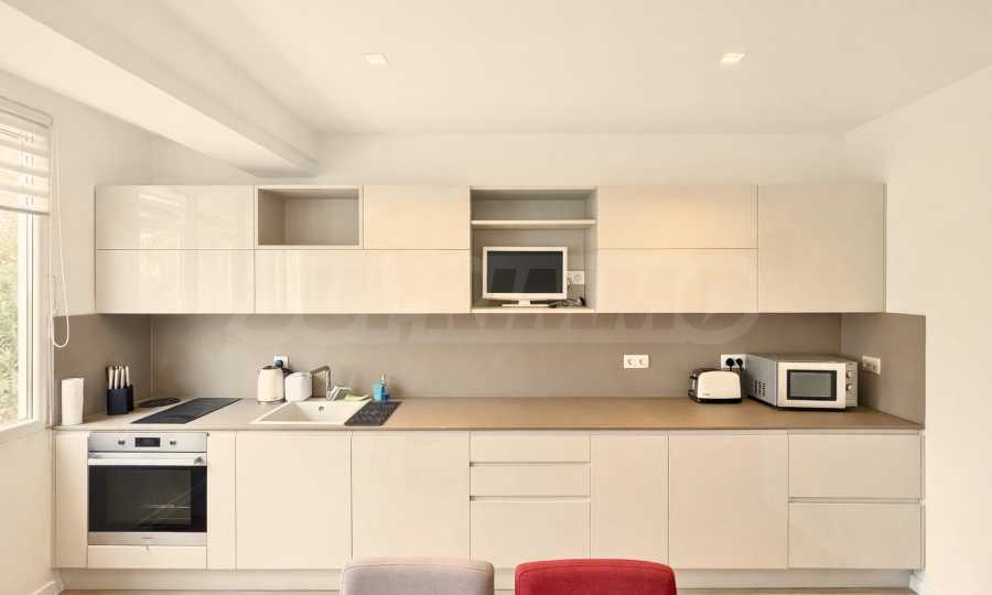 Интериорът е изпълнен в изчистен, модерен стил с топли тонове и качествени материали. Дневната зона е просторна и уютна, с комфортна мека мебел и излаз към тераса с гледка към зеленина. Кухнята е изцяло оборудвана с италиански мебели и електроуреди, с удобна работна площ и трапезарна част.