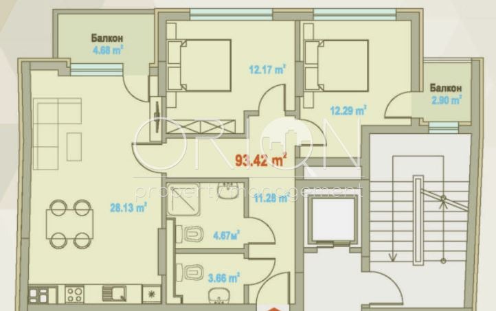 Жилището е с обща площ от 93 кв.м. и разпределение: