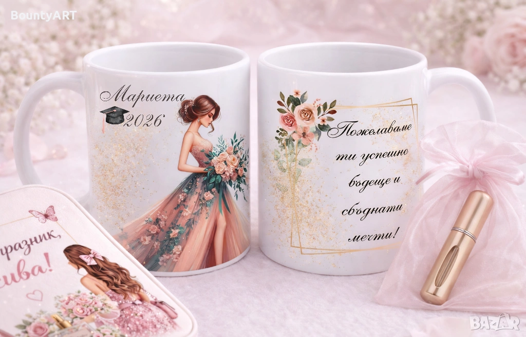 Подарете незабравим спомен на Вашата абитуриентка! Елегантен и нежен комплект, изработен с име по Ваш избор.