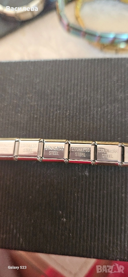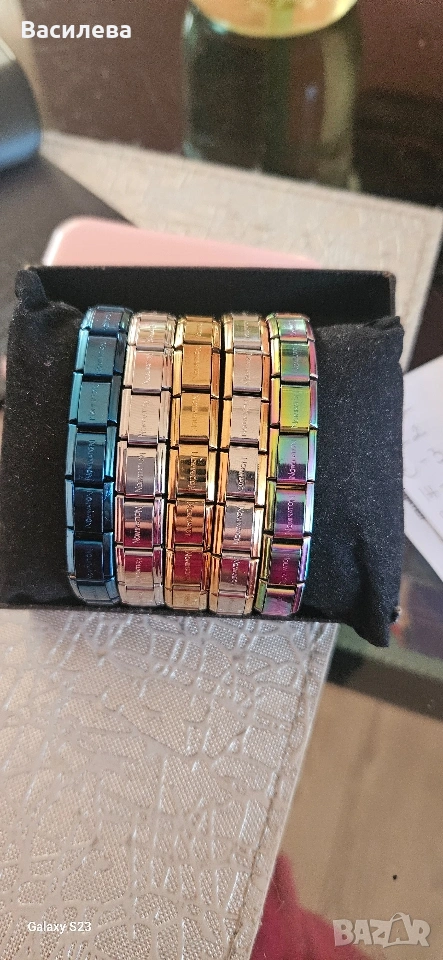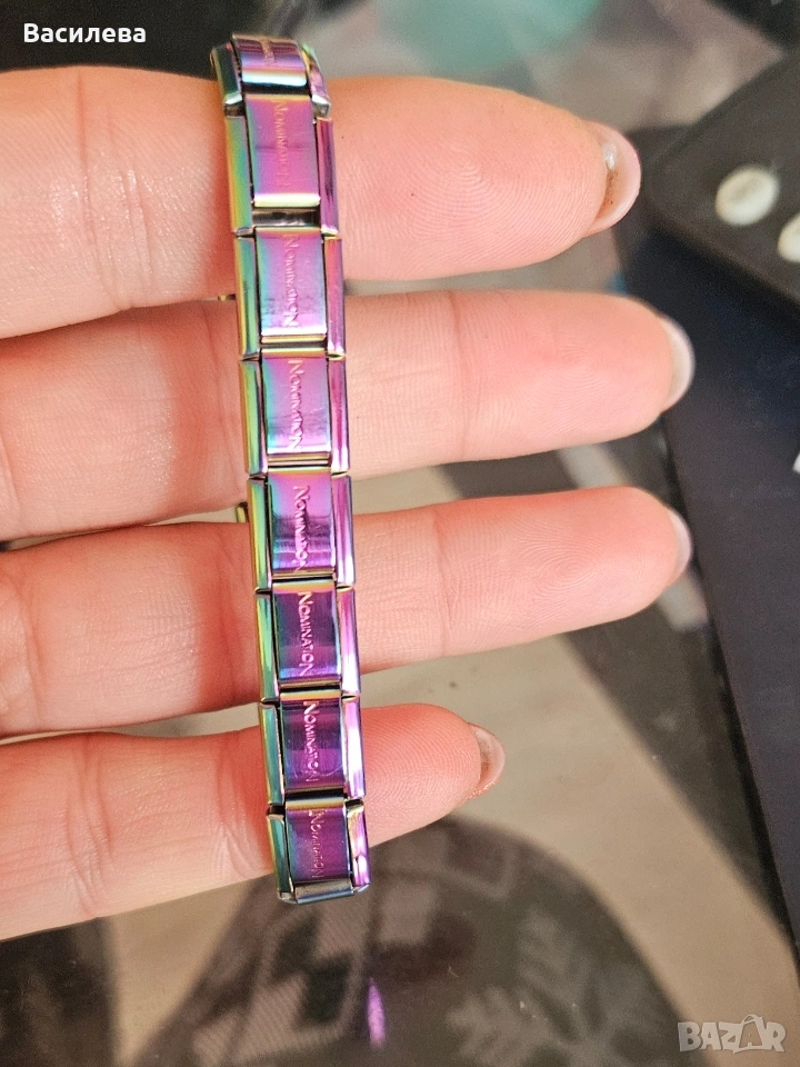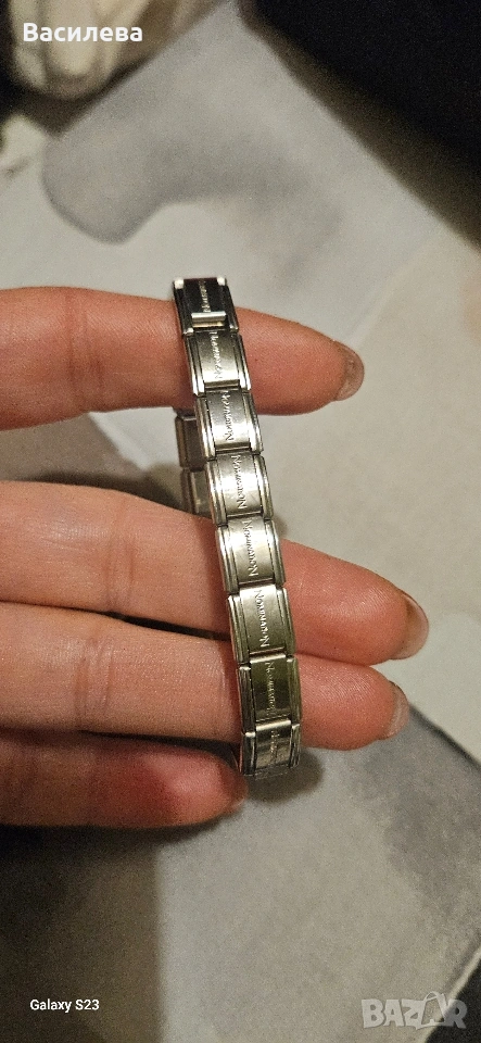 Нова композивна гривна Nominatoin.Височина 9мм. дължина 18см.Изработена е от медицинска стомана.Има надпис stainless steel отвътрешната страна и Nomination отвънка.